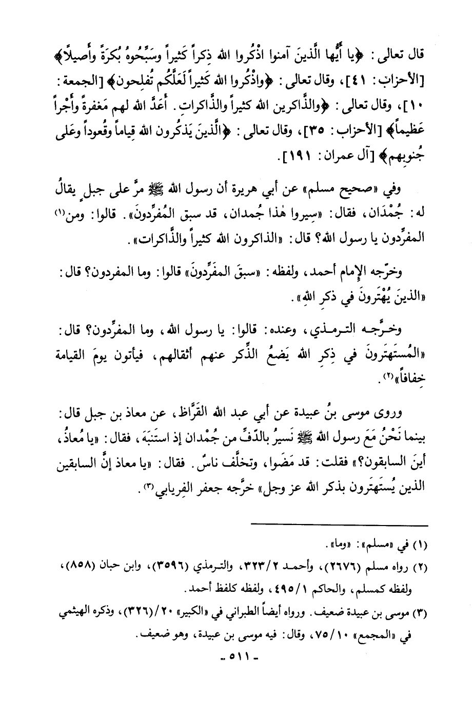 قَالَ تَعَالَى: {يَاأَيُّهَا الَّذِينَ آمَنُوا اذْكُرُوا اللَّهَ ذِكْرًا كَثِيرًا - وَسَبِّحُوهُ بُكْرَةً وَأَصِيلًا} [الأحزاب: 41 - 42] [الْأَحْزَابِ: 41] ، وَقَالَ تَعَالَى: {وَاذْكُرُوا اللَّهَ كَثِيرًا لَعَلَّكُمْ تُفْلِحُونَ} [الأنفال: 45] [الْجُمُعَةِ: 10] ، وَقَالَ تَعَالَى: {وَالذَّاكِرِينَ اللَّهَ كَثِيرًا وَالذَّاكِرَاتِ أَعَدَّ اللَّهُ لَهُمْ مَغْفِرَةً وَأَجْرًا عَظِيمًا} [الأحزاب: 35] [الْأَحْزَابِ: 35] ، وَقَالَ تَعَالَى: {الَّذِينَ يَذْكُرُونَ اللَّهَ قِيَامًا وَقُعُودًا وَعَلَى جُنُوبِهِمْ} [آل عمران: 191] [آلِ عِمْرَانَ: 191] . وَفِي " صَحِيحِ مُسْلِمٍ " عَنْ أَبِي هُرَيْرَةَ «أَنَّ رَسُولَ اللَّهِ - صَلَّى اللَّهُ عَلَيْهِ وَسَلَّمَ - مَرَّ عَلَى جَبَلٍ يُقَالُ لَهُ: جُمْدَانَ، فَقَالَ: سِيرُوا هَذَا جُمْدَانَ، قَدْ سَبَقَ الْمُفَرِّدُونَ قَالُوا: وَمَنِ الْمُفَرِّدُونَ يَا رَسُولَ اللَّهِ؟ قَالَ: الذَّاكِرُونَ اللَّهَ كَثِيرًا وَالذَّاكِرَاتُ» . وَخَرَّجَهُ الْإِمَامُ أَحْمَدُ، وَلَفْظُهُ: «سَبَقُ الْمُفَرِّدُونَ قَالُوا: وَمَا الْمُفَرِّدُونَ؟ قَالَ: الَّذِينَ يُهْتَرُونَ فِي ذِكْرِ اللَّهِ» . وَخَرَّجَهُ التِّرْمِذِيُّ، وَعِنْدَهُ: «قَالُوا: يَا رَسُولَ اللَّهِ، وَمَا الْمُفَرِّدُونَ؟ قَالَ: الْمُسْتَهْتَرُونَ فِي ذِكْرِ اللَّهِ يَضَعُ الذِّكْرُ عَنْهُمْ أَثْقَالَهُمْ، فَيَأْتُونَ يَوْمَ الْقِيَامَةِ خِفَافًا» . وَرَوَى مُوسَى بْنُ عُبَيْدَةَ عَنْ أَبِي عَبْدِ اللَّهِ الْقَرَّاظِ، عَنْ مُعَاذِ بْنِ جَبَلٍ قَالَ: «بَيْنَمَا نَحْنُ مَعَ رَسُولِ اللَّهِ - صَلَّى اللَّهُ عَلَيْهِ وَسَلَّمَ - نَسِيرُ بِالدُّفِّ مِنْ جُمْدَانَ إِذِ اسْتَنْبَهَ، فَقَالَ: يَا مُعَاذُ أَيْنَ السَّابِقُونَ؟ فَقُلْتُ: قَدْ مَضَوْا وَتَخَلَّفَ أُنَاسٌ. فَقَالَ: يَا مُعَاذُ إِنَّ السَّابِقِينَ الَّذِينَ يُسْتَهْتَرُونَ بِذِكْرِ اللَّهِ عَزَّ وَجَلَّ» خَرَّجَهُ جَعْفَرٌ الْفِرْيَابِيُّ.