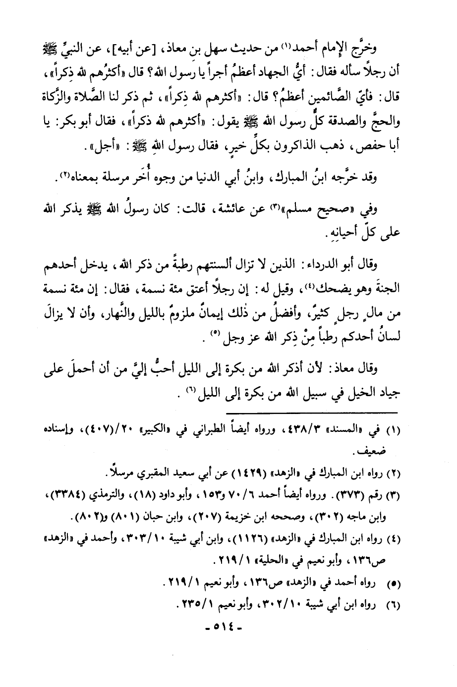 وَخَرَّجَ الْإِمَامُ أَحْمَدُ مِنْ حَدِيثِ سَهْلِ بْنِ مُعَاذٍ، [عَنْ أَبِيهِ] ، عَنِ النَّبِيِّ - صَلَّى اللَّهُ عَلَيْهِ وَسَلَّمَ - «أَنَّ رَجُلًا سَأَلَهُ فَقَالَ: أَيُّ الْجِهَادِ أَعْظَمُ أَجْرًا يَا رَسُولَ اللَّهِ؟ قَالَ: أَكْثَرُهُمْ لِلَّهِ ذِكْرًا، قَالَ: فَأَيُّ الصَّائِمِينَ أَعْظَمُ؟ قَالَ: أَكْثَرُهُمْ لِلَّهِ ذِكْرًا، ثُمَّ ذَكَرَ لَنَا الصَّلَاةَ وَالزَّكَاةَ وَالْحَجَّ وَالصَّدَقَةَ كُلٌّ رَسُولُ اللَّهِ - صَلَّى اللَّهُ عَلَيْهِ وَسَلَّمَ - يَقُولُ: أَكْثَرُهُمْ لِلَّهِ ذِكْرًا:، فَقَالَ أَبُو بَكْرٍ: يَا أَبَا حَفْصٍ، ذَهَبَ الذَّاكِرُونَ بِكُلِّ خَيْرٍ، فَقَالَ رَسُولُ اللَّهِ - صَلَّى اللَّهُ عَلَيْهِ وَسَلَّمَ -: أَجَلْ» . وَقَدْ خَرَّجَهُ ابْنُ الْمُبَارَكِ، وَابْنُ أَبِي الدُّنْيَا مِنْ وُجُوهِ مُرْسَلَةٍ بِمَعْنَاهُ. وَفِي " صَحِيحِ مُسْلِمٍ " عَنْ عَائِشَةَ، قَالَتْ: «كَانَ رَسُولُ اللَّهِ - صَلَّى اللَّهُ عَلَيْهِ وَسَلَّمَ - يَذْكُرُ اللَّهَ عَلَى كُلِّ أَحْيَانِهِ» . وَقَالَ أَبُو الدَّرْدَاءِ: الَّذِينَ لَا تَزَالُ أَلْسِنَتُهُمْ رَطْبَةً مِنْ ذِكْرِ اللَّهِ، يَدْخُلُ أَحَدَهُمَا الْجَنَّةَ وَهُوَ يَضْحَكُ، وَقِيلَ لَهُ: إِنَّ رَجُلًا أَعْتَقَ مِائَةَ نَسَمَةٍ، فَقَالَ: إِنَّ مِائَةَ نَسَمَةٍ مِنْ مَالِ رَجُلٍ كَثِيرٌ، وَأَفْضَلُ مِنْ ذَلِكَ إِيمَانٌ مَلْزُومٌ بِاللَّيْلِ وَالنَّهَارِ، وَأَنْ لَا يَزَالَ لِسَانُ أَحَدِكُمْ رَطْبًا مِنْ ذِكْرِ اللَّهِ عَزَّ وَجَلَّ. وَقَالَ مُعَاذٌ: لَأَنْ أَذْكُرَ اللَّهَ مِنْ بُكْرَةٍ إِلَى اللَّيْلِ أَحَبُّ إِلَيَّ مِنْ أَنْ أَحْمِلَ عَلَى جِيَادِ الْخَيْلِ فِي سَبِيلِ اللَّهِ مِنْ بُكْرَةٍ إِلَى اللَّيْلِ.