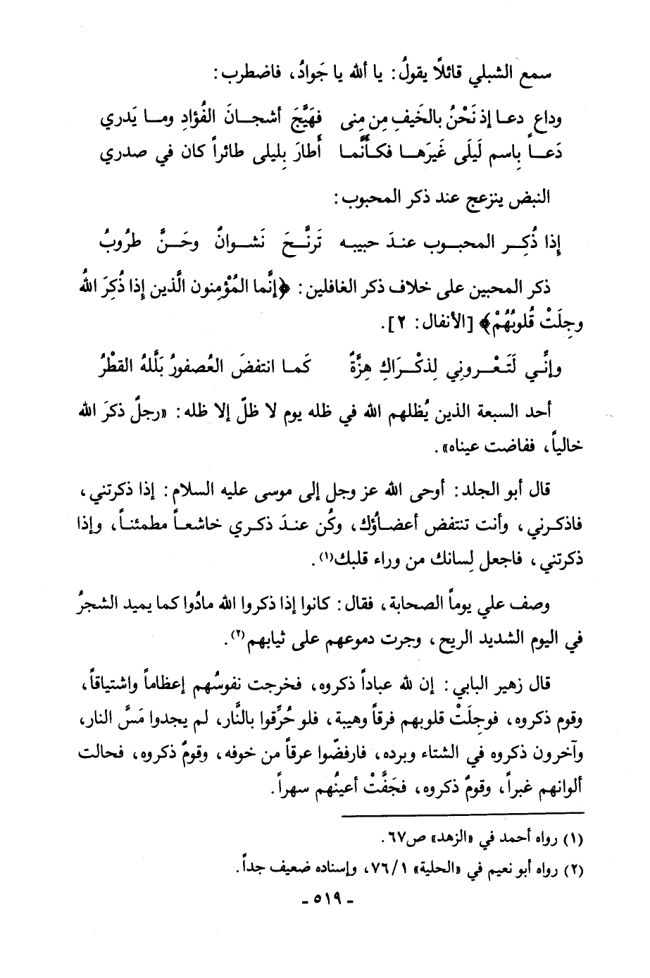 أَحَدُ السَّبْعَةِ الَّذِينَ يُظِلُّهُمُ اللَّهُ فِي ظِلِّهِ يَوْمَ لَا ظِلَّ إِلَّا ظِلُّهُ: «رَجُلٌ ذَكَرَ اللَّهَ خَالِيًا فَفَاضَتْ عَيْنَاهُ» . قَالَ أَبُو الْجِلْدِ: «أَوْحَى اللَّهُ عَزَّ وَجَلَّ إِلَى مُوسَى عَلَيْهِ السَّلَامُ: إِذَا ذَكَرْتَنِي، فَاذْكُرْنِي، وَأَنْتَ تَنْتَفِضُ أَعْضَاؤُكَ، وَكُنْ عِنْدَ ذِكْرِي خَاشِعًا مُطْمَئِنًا، وَإِذَا ذَكَرْتَنِي، فَاجْعَلْ لِسَانَكَ مِنْ وَرَاءِ قَلْبِكَ» . وَصَفَ عَلِيٌّ يَوْمًا الصَّحَابَةَ، فَقَالَ: كَانُوا إِذَا ذَكَرُوا اللَّهَ مَادُوا كَمَا يَمِيدُ الشَّجَرِ فِي الْيَوْمِ الشَّدِيدِ الرِّيحِ، وَجَرَتْ دُمُوعُهُمْ عَلَى ثِيَابِهِمْ. قَالَ زُهَيْرٌ الْبَابِيُّ: إِنَّ لِلَّهِ عِبَادًا ذَكَرُوهُ، فَخَرَجَتْ نُفُوسُهُمْ إِعْظَامًا وَاشْتِيَاقًا، وَقَوْمٌ ذَكَرُوهُ، فَوَجِلَتْ قُلُوبُهُمْ فَرَقًا وَهَيْبَةً، فَلَوْ حُرِّقُوا بِالنَّارِ، لَمْ يَجِدُوا مَسَّ النَّارِ، وَآخَرُونَ ذَكَرُوهُ فِي الشِّتَاءِ وَبَرْدِهِ فَارْفَضُّوا عَرَقًا مِنْ خَوْفِهِ، وَقَوْمٌ ذَكَرُوهُ، فَحَالَتْ أَلْوَانُهُمْ غُبْرًا، وَقَوْمٌ ذَكَرُوهُ فَجَفَّتْ أَعْيُنُهُمْ سَهَرًا.