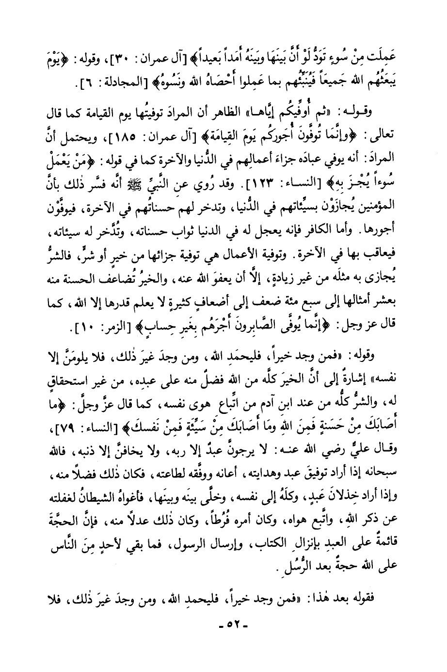 [آلِ عِمْرَانَ: 30] ، وَقَوْلِهِ: {يَوْمَ يَبْعَثُهُمُ اللَّهُ جَمِيعًا فَيُنَبِّئُهُمْ بِمَا عَمِلُوا أَحْصَاهُ اللَّهُ وَنَسُوهُ} [المجادلة: 6] [الْمُجَادَلَةِ: 6] . وَقَوْلِهِ: " ثُمَّ أُوَفِّيكُمْ إِيَّاهَا " الظَّاهِرُ أَنَّ الْمُرَادَ تَوْفِيَتُهَا يَوْمَ الْقِيَامَةِ كَمَا قَالَ تَعَالَى: {وَإِنَّمَا تُوَفَّوْنَ أُجُورَكُمْ يَوْمَ الْقِيَامَةِ} [آل عمران: 185] [آلِ عِمْرَانَ: 185] وَيُحْتَمَلُ أَنَّ الْمُرَادَ: يُوَفِّي عِبَادَهُ جَزَاءَ أَعْمَالِهِمْ فِي الدُّنْيَا وَالْآخِرَةِ كَمَا فِي قَوْلِهِ: {مَنْ يَعْمَلْ سُوءًا يُجْزَ بِهِ} [النساء: 123] [النِّسَاءِ: 123] . وَقَدْ رُوِيَ عَنِ النَّبِيِّ صَلَّى اللَّهُ عَلَيْهِ وَسَلَّمَ أَنَّهُ فَسَّرَ ذَلِكَ بِأَنَّ الْمُؤْمِنِينَ يُجَازَوْنَ بِسَيِّئَاتِهِمْ فِي الدِّينَا، وَتُدَّخَرُ لَهُمْ حَسَنَاتُهُمْ فِي الْآخِرَةِ، فَيُوَفَّوْنَ أُجُورَهَا. وَأَمَّا الْكَافِرُ فَإِنَّهُ يُعَجَّلُ لَهُ فِي الدُّنْيَا ثَوَابُ حَسَنَاتِهِ، وَتُدَّخَرُ لَهُ سَيِّئَاتُهُ، فَيُعَاقَبُ بِهَا فِي الْآخِرَةِ، وَتَوْفِيَةُ الْأَعْمَالِ هِيَ تَوْفِيَةُ جَزَائِهَا مَنْ خَيْرٍ أَوْ شَرٍّ، فَالشَّرُّ يُجَازَى بِهِ مِثْلُهُ مِنْ غَيْرِ زِيَادَةٍ، إِلَّا أَنْ يَعْفُوَ اللَّهُ عَنْهُ، وَالْخَيْرُ تُضَاعَفُ الْحَسَنَةُ مِنْهُ بِعَشْرِ أَمْثَالِهَا إِلَى سَبْعِمِائَةِ ضِعْفٍ إِلَى أَضْعَافٍ كَثِيرَةٍ لَا يَعْلَمُ قَدْرَهَا إِلَّا اللَّهُ، كَمَا قَالَ اللَّهُ عَزَّ وَجَلَّ: {إِنَّمَا يُوَفَّى الصَّابِرُونَ أَجْرَهُمْ بِغَيْرِ حِسَابٍ} [الزمر: 10] [الزُّمَرِ: 10] . وَقَوْلُهُ: " «فَمَنْ وَجَدَ خَيْرًا فَلْيَحْمَدِ اللَّهَ، وَمَنْ وَجَدَ غَيْرَ ذَلِكَ، فَلَا يَلُومَنَّ إِلَّا نَفْسَهُ» " إِشَارَةٌ إِلَى أَنَّ الْخَيْرَ كُلَّهُ مِنَ اللَّهِ فَضْلٌ مِنْهُ عَلَى عَبْدِهِ، مِنْ غَيْرِ اسْتِحْقَاقٍ لَهُ، وَالشَّرُّ كُلُّهُ مِنْ عِنْدِ ابْنِ آدَمَ مِنَ اتِّبَاعِ هَوَى نَفْسِهِ، كَمَا قَالَ عَزَّ وَجَلَّ: {مَا أَصَابَكَ مِنْ حَسَنَةٍ فَمِنَ اللَّهِ وَمَا أَصَابَكَ مِنْ سَيِّئَةٍ فَمِنْ نَفْسِكَ} [النساء: 79] [النِّسَاءِ: 79] ، وَقَالَ عَلِيٌّ رَضِيَ اللَّهُ عَنْهُ: لَا يَرْجُوَنَّ عَبْدٌ إِلَّا رَبَّهُ، وَلَا يَخَافَنَّ إِلَّا ذَنْبَهُ، فَاللَّهُ سُبْحَانَهُ إِذَا أَرَادَ تَوْفِيقَ عَبْدٍ وَهِدَايَتَهُ أَعَانَهُ وَوَفَّقَهُ لِطَاعَتِهِ، فَكَانَ ذَلِكَ فَضْلًا مِنْهُ، وَإِذَا أَرَادَ خِذْلَانَ عَبْدٍ، وَكَلَهُ إِلَى نَفْسِهِ، وَخَلَّى بَيْنَهُ وَبَيْنَهَا، فَأَغْوَاهُ الشَّيْطَانُ لِغَفْلَتِهِ عَنْ ذِكْرِ اللَّهِ، وَاتَّبَعَ هَوَاهُ، وَكَانَ أَمْرُهُ فُرُطًا، وَكَانَ ذَلِكَ عَدْلًا مِنْهُ، فَإِنَّ الْحُجَّةَ قَائِمَةٌ عَلَى الْعَبْدِ بِإِنْزَالِ الْكِتَابِ، وَإِرْسَالِ الرَّسُولِ، فَمَا بَقِيَ لِأَحَدٍ مِنَ النَّاسِ عَلَى اللَّهِ حُجَّةٌ بَعْدَ الرُّسُلِ. فَقَوْلُهُ بَعْدَ هَذَا: " «فَمَنْ وَجَدَ خَيْرًا، فَلْيَحْمَدِ اللَّهَ، وَمِنْ وَجَدَ غَيْرَ ذَلِكَ فَلَا