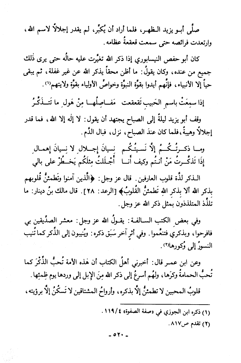 الذِّكْرُ لَذَّةُ قُلُوبِ الْعَارِفِينَ. قَالَ اللَّهُ عَزَّ وَجَلَّ: {الَّذِينَ آمَنُوا وَتَطْمَئِنُّ قُلُوبُهُمْ بِذِكْرِ اللَّهِ أَلَا بِذِكْرِ اللَّهِ تَطْمَئِنُّ الْقُلُوبُ} [الرعد: 28] [الرَّعْدِ: 28] . قَالَ مَالِكُ بْنُ دِينَارٍ: مَا تَلَذَّذَ الْمُتَلَذِّذُونَ بِمِثْلِ ذِكْرِ اللَّهِ عَزَّ وَجَلَّ. وَفِي بَعْضِ الْكُتُبِ السَّالِفَةِ: يَقُولُ اللَّهُ عَزَّ وَجَلَّ: مَعْشَرَ الصِّدِّيقِينَ بِي فَافْرَحُوا، وَبِذِكْرِي فَتَنَعَّمُوا. وَفِي أَثَرٍ آخَرَ سَبَقَ ذِكْرُهُ: وَيُنِيبُونَ إِلَى الذِّكْرِ كَمَا تُنِيبُ النُّسُورُ إِلَى وُكُورِهَا. وَعَنِ ابْنِ عُمَرَ قَالَ: أَخْبَرَنِي أَهْلُ الْكِتَابِ أَنَّ هَذِهِ الْأُمَّةَ تُحِبُّ الذِّكْرِ كَمَا تُحِبُّ الْحَمَامَةُ وَكْرَهَا، وَلَهُمْ أَسْرَعُ إِلَى ذِكْرِ اللَّهِ مِنَ الْإِبِلِ إِلَى وِرْدِهَا يَوْمَ ظَمَئِهَا. قُلُوبُ الْمُحِبِّينَ لَا تَطْمَئِنُّ إِلَّا بِذِكْرِهِ، وَأَرْوَاحُ الْمُشْتَاقِينَ لَا تَسْكُنُ إِلَّا بِرُؤْيَتِهِ،
