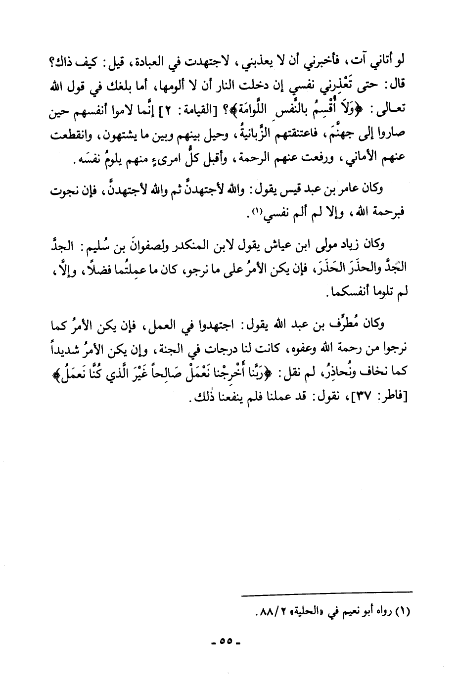 لَوْ أَتَانِي آتٍ، فَأَخْبَرَنِي أَنْ لَا يُعَذِّبَنِي، لَاجْتَهَدْتُ فِي الْعِبَادَةِ، قِيلَ: كَيْفَ ذَاكَ؟ قَالَ: حَتَّى تَعْذِرَنِي نَفْسِي إِنْ دَخَلْتُ النَّارَ أَنْ لَا أَلُومَهَا، أَمَا بَلَغَكَ فِي قَوْلِ اللَّهِ تَعَالَى: {وَلَا أُقْسِمُ بِالنَّفْسِ اللَّوَّامَةِ} [القيامة: 2] ؟ [الْقِيَامَةِ: 2] إِنَّمَا لَامُوا أَنْفُسَهُمْ حِينَ صَارُوا إِلَى جَهَنَّمَ، فَاعْتَنَقَتْهُمُ الزَّبَانِيَةُ، وَحِيلَ بَيْنَهُمْ وَبَيْنَ مَا يَشْتَهُونَ، وَانْقَطَعَتْ عَنْهُمُ الْأَمَانِيُّ، وَرُفِعَتْ عَنْهُمُ الرَّحْمَةُ، وَأَقْبَلَ كُلُّ امْرِئٍ مِنْهُمْ يَلُومُ نَفْسَهُ. وَكَانَ عَامِرُ بْنُ عَبْدِ قِيسٍ يَقُولُ: وَاللَّهِ لَأَجْتَهِدَنَّ ثُمَّ وَاللَّهِ لَأَجْتَهِدَنَّ، فَإِنْ نَجَوْتُ فَبِرَحْمَةِ اللَّهِ، وَإِلَّا لَمْ أَلُمْ نَفْسِي. وَكَانَ زِيَادٌ مَوْلَى ابْنِ عَيَّاشٍ يَقُولُ لِابْنِ الْمُنْكَدِرِ وَلِصَفْوَانَ بْنِ سُلَيْمٍ: الْجِدَّ الْجِدَّ وَالْحَذَرَ الْحَذَرَ، فَإِنْ يَكُنِ الْأَمْرُ عَلَى مَا نَرْجُو كَانَ مَا عَمِلْتُمَا فَضْلًا، وَإِلَّا لَمْ تَلُومَا أَنْفُسَكُمَا. وَكَانَ مُطَرِّفُ بْنُ عَبْدِ اللَّهِ يَقُولُ: اجْتَهَدُوا فِي الْعَمَلِ، فَإِنْ يَكُنِ الْأَمْرُ كَمَا نَرْجُو مِنْ رَحْمَةِ اللَّهِ وَعَفْوِهِ، كَانَتْ لَنَا دَرَجَاتٌ فِي الْجَنَّةِ، وَإِنْ يَكُنِ الْأَمْرُ شَدِيدًا كَمَا نَخَافُ وَنُحَاذِرُ، لَمْ نَقُلْ: {رَبَّنَا أَخْرِجْنَا نَعْمَلْ صَالِحًا غَيْرَ الَّذِي كُنَّا نَعْمَلُ} [فاطر: 37] [فَاطِرٍ: 37] ، نَقُولُ: قَدْ عَمِلْنَا فَلَمْ يَنْفَعْنَا ذَلِكَ.
