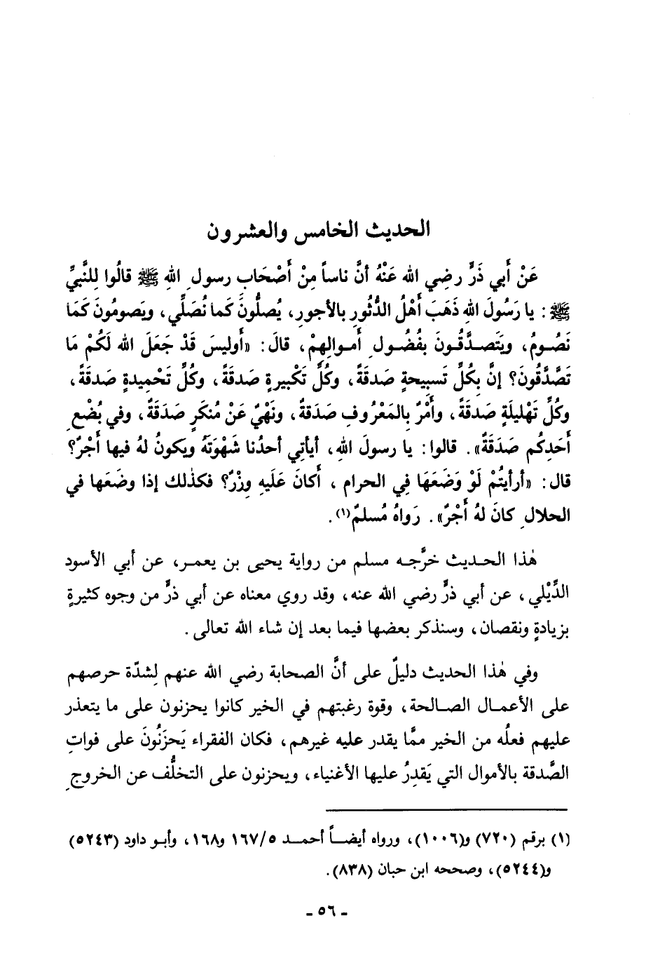 الْحَدِيثُ الْخَامِسُ وَالْعِشْرُونَ. عَنْ أَبِي ذَرٍّ رَضِيَ اللَّهُ عَنْهُ أَيْضًا «أَنَّ نَاسًا مِنْ أَصْحَابِ رَسُولِ اللَّهِ صَلَّى اللَّهُ عَلَيْهِ وَسَلَّمَ قَالُوا لِلنَّبِيِّ صَلَّى اللَّهُ عَلَيْهِ وَسَلَّمَ: يَا رَسُولَ اللَّهِ ذَهَبَ أَهْلُ الدُّثُورِ بِالْأُجُورِ، يُصَلُّونَ كَمَا نُصَلِّي، وَيَصُومُونَ كَمَا نَصُومُ، وَيَتَصَدَّقُونَ بِفُضُولِ أَمْوَالِهِمْ، قَالَ: أَوَلَيَسَ قَدْ جَعَلَ اللَّهُ لَكُمْ مَا تَصَّدَّقُونَ؟ إِنَّ بِكُلِّ تَسْبِيحَةٍ صَدَقَةً، وَكُلِّ تَكْبِيرَةٍ صَدَقَةً، وَكُلِّ تَحْمِيدَةٍ صَدَقَةً، وَكُلِّ تَهْلِيلَةٍ صَدَقَةً، وَأَمْرٌ بِالْمَعْرُوفِ صَدَقَةٌ، وَنَهْيٌ عَنْ مُنْكَرٍ صَدَقَةٌ، وَفِي بُضْعِ أَحَدِكُمْ صَدَقَةٌ قَالُوا: يَا رَسُولَ اللَّهِ أَيَأْتِي أَحَدُنَا شَهْوَتَهُ وَيَكُونُ لَهُ فِيهَا أَجْرٌ؟ قَالَ: أَرَأَيْتُمْ لَوْ وَضَعَهَا فِي حَرَامٍ، أَكَانَ عَلَيْهِ وِزْرٌ؟ فَكَذَلِكَ إِذَا وَضَعَهَا فِي الْحَلَالِ كَانَ لَهُ أَجْرٌ» . رَوَاهُ مُسْلِمٌ.