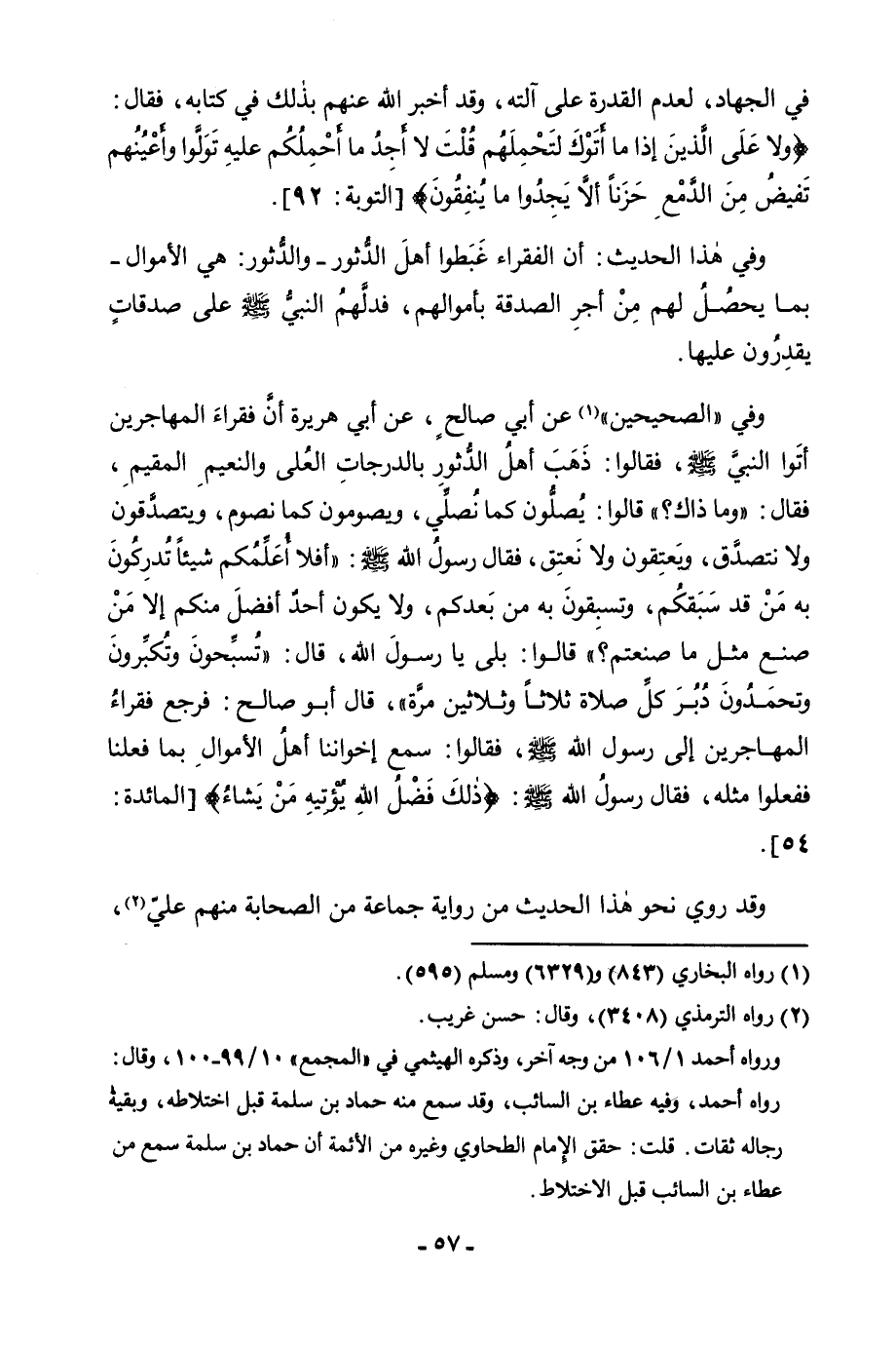 فِي الْجِهَادِ، لِعَدَمِ الْقُدْرَةِ عَلَى آلَتِهِ، وَقَدْ أَخْبَرَ اللَّهُ عَنْهُمْ بِذَلِكَ فِي كِتَابِهِ، فَقَالَ: {وَلَا عَلَى الَّذِينَ إِذَا مَا أَتَوْكَ لِتَحْمِلَهُمْ قُلْتَ لَا أَجِدُ مَا أَحْمِلُكُمْ عَلَيْهِ تَوَلَّوْا وَأَعْيُنُهُمْ تَفِيضُ مِنَ الدَّمْعِ حَزَنًا أَلَّا يَجِدُوا مَا يُنْفِقُونَ} [التوبة: 92] [التَّوْبَةِ: 92] . وَفِي هَذَا الْحَدِيثِ: أَنَّ الْفُقَرَاءَ غَبَطُوا أَهْلَ الدُّثُورِ - وَالدُّثُورُ: هِيَ الْأَمْوَالُ - مِمَّا يَحْصُلُ لَهُمْ مِنْ أَجْرِ الصَّدَقَةِ بِأَمْوَالِهِمْ، فَدَلَّهُمُ النَّبِيُّ صَلَّى اللَّهُ عَلَيْهِ وَسَلَّمَ عَلَى صَدَقَاتٍ يَقْدِرُونَ عَلَيْهَا. وَفِي " الصَّحِيحَيْنِ " عَنْ أَبِي صَالِحٍ، عَنْ أَبِي هُرَيْرَةَ «أَنَّ فُقَرَاءَ الْمُهَاجِرِينَ أَتَوُا النَّبِيَّ صَلَّى اللَّهُ عَلَيْهِ وَسَلَّمَ، فَقَالُوا: ذَهَبَ أَهْلُ الدُّثُورِ بِالدَّرَجَاتِ الْعُلَى وَالنَّعِيمِ الْمُقِيمِ، فَقَالَ: " وَمَا ذَاكَ؟ " قَالُوا: يُصَلُّونَ كَمَا نُصَلِّي، وَيَصُومُونَ كَمَا نَصُومُ، وَيَتَصَدَّقُونَ وَلَا نَتَصَدَّقُ، وَيَعْتِقُونَ وَلَا نَعْتِقُ، فَقَالَ رَسُولُ اللَّهِ صَلَّى اللَّهُ عَلَيْهِ وَسَلَّمَ: " أَفَلَا أُعَلِّمُكُمْ شَيْئًا تُدْرِكُونَ بِهِ مَنْ قَدْ سَبَقَكُمْ، وَتَسْبِقُونَ بِهِ مَنْ بَعْدَكُمْ، وَلَا يَكُونُ أَحَدٌ أَفْضَلَ مِنْكُمْ إِلَّا مَنْ صَنَعَ مِثْلَ مَا صَنَعْتُمْ؟ " قَالُوا: بَلَى يَا رَسُولَ اللَّهِ، قَالَ: " تُسَبِّحُونَ وَتُكَبِّرُونَ وَتَحْمَدُونَ دُبُرَ كُلِّ صَلَاةٍ ثَلَاثًا وَثَلَاثِينَ مَرَّةً "، قَالَ أَبُو صَالِحٍ: فَرَجَعَ فُقَرَاءُ الْمُهَاجِرِينَ إِلَى رَسُولِ اللَّهِ صَلَّى اللَّهُ عَلَيْهِ وَسَلَّمَ، فَقَالُوا: سَمِعَ إِخْوَانُنَا أَهْلُ الْأَمْوَالِ بِمَا فَعَلْنَا فَفَعَلُوا مِثْلَهُ، فَقَالَ رَسُولُ اللَّهِ صَلَّى اللَّهُ عَلَيْهِ وَسَلَّمَ: {ذَلِكَ فَضْلُ اللَّهِ يُؤْتِيهِ مَنْ يَشَاءُ} [المائدة: 54] [الْمَائِدَةِ: 54] .» وَقَدْ رُوِيَ نَحْوُ هَذَا الْحَدِيثِ مِنْ رِوَايَةِ جَمَاعَةٍ مِنَ الصَّحَابَةِ مِنْهُمْ عَلِيٌّ،