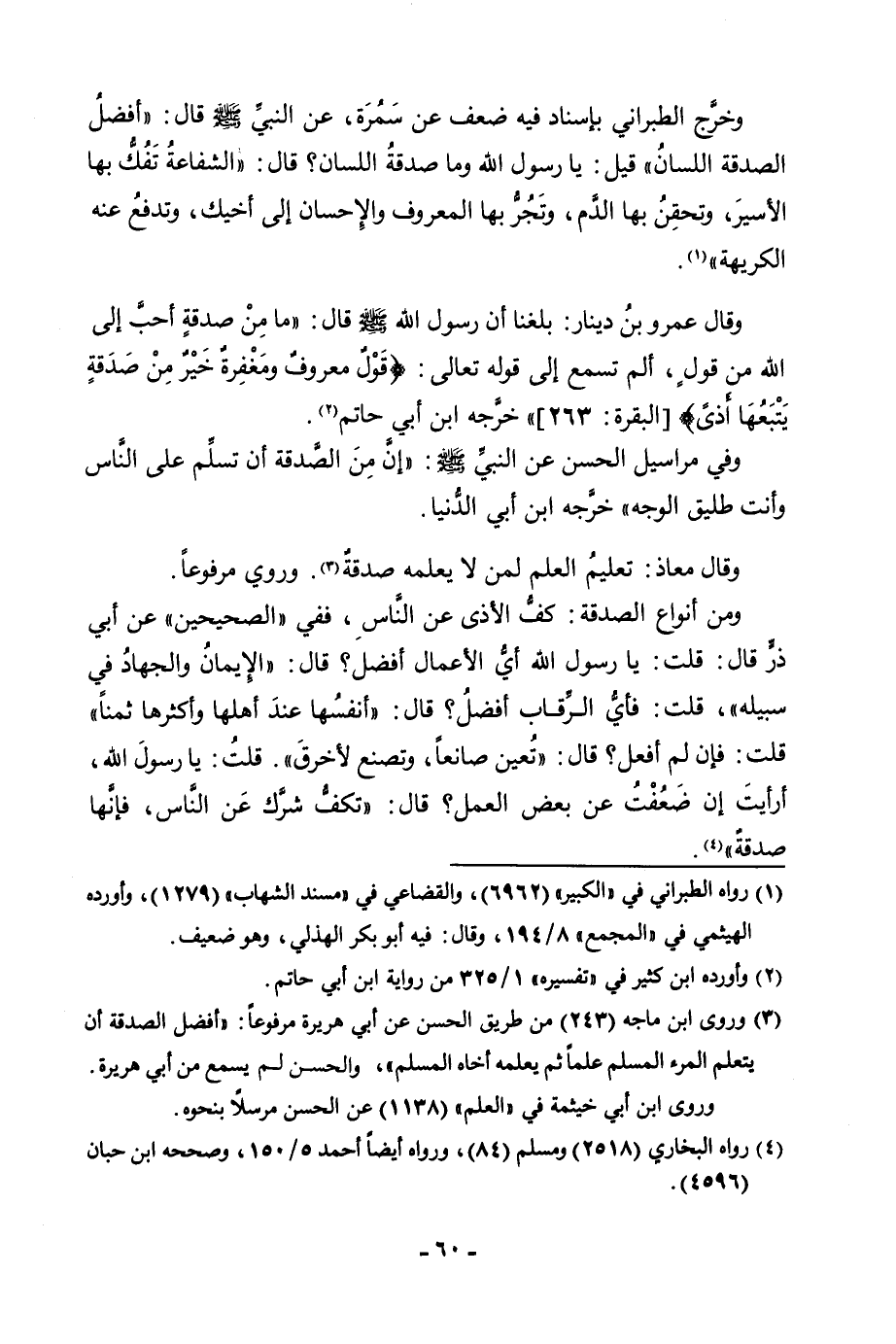 وَخَرَّجَ الطَّبَرَانِيُّ بِإِسْنَادٍ فِيهِ ضَعْفٌ عَنْ سَمُرَةَ، عَنِ النَّبِيِّ صَلَّى اللَّهُ عَلَيْهِ وَسَلَّمَ: " «أَفْضَلُ الصَّدَقَةِ صَدَقَةُ اللِّسَانِ " قِيلَ: يَا رَسُولَ اللَّهِ، وَمَا صَدَقَةُ اللِّسَانِ؟ قَالَ: " الشَّفَاعَةُ تَفُكُّ بِهَا الْأَسِيرَ، وَتَحْقِنُ بِهَا الدَّمَ، وَتَجُرُّ بِهَا الْمَعْرُوفَ وَالْإِحْسَانَ إِلَى أَخِيكَ، وَتَدْفَعُ عَنْهُ الْكَرِيهَةَ» ". وَقَالَ عَمْرُو بْنُ دِينَارٍ: بَلَغَنَا أَنَّ رَسُولَ اللَّهِ صَلَّى اللَّهُ عَلَيْهِ وَسَلَّمَ قَالَ: " «مَا مِنْ صَدَقَةٍ أَحَبُّ إِلَى اللَّهِ مِنْ قَوْلٍ، أَلَمْ تَسْمَعْ إِلَى قَوْلِهِ تَعَالَى: {قَوْلٌ مَعْرُوفٌ وَمَغْفِرَةٌ خَيْرٌ مِنْ صَدَقَةٍ يَتْبَعُهَا أَذًى} [البقرة: 263] » [الْبَقَرَةِ: 263] " خَرَّجَهُ ابْنُ أَبِي حَاتِمٍ. وَفِي مَرَاسِيلِ الْحَسَنِ عَنِ النَّبِيِّ صَلَّى اللَّهُ عَلَيْهِ وَسَلَّمَ: " «إِنَّ مِنَ الصَّدَقَةِ أَنْ تُسَلِّمَ عَلَى النَّاسِ وَأَنْتَ طَلِيقُ الْوَجْهِ» " خَرَّجَهُ ابْنُ أَبِي الدُّنْيَا. وَقَالَ مُعَاذٌ: تَعْلِيمُ الْعِلْمِ لِمَنْ لَا يَعْلَمُهُ صَدَقَةٌ. وَرُوِيَ مَرْفُوعًا. وَمِنْ أَنْوَاعِ الصَّدَقَةِ كَفُّ الْأَذَى عَنِ النَّاسِ، فَفِي " الصَّحِيحَيْنِ " «عَنْ أَبِي ذَرٍّ قَالَ: قُلْتُ: يَا رَسُولَ اللَّهِ أَيُّ الْأَعْمَالِ أَفْضَلُ؟ قَالَ: الْإِيمَانُ بِاللَّهِ وَالْجِهَادُ فِي سَبِيلِهِ " قُلْتُ: فَأَيُّ الرِّقَابِ أَفْضَلُ؟ قَالَ: " أَنْفَسُهَا عِنْدَ أَهْلِهَا وَأَكْثَرُهَا ثَمَنًا " قُلْتُ: فَإِنْ لَمْ أَفْعَلْ؟ قَالَ: " تُعِينُ صَانِعًا، وَتَصْنَعُ لِأَخْرَقَ ". قُلْتُ: يَا رَسُولَ اللَّهِ، أَرَأَيْتَ إِنْ ضَعُفْتُ عَنْ بَعْضِ الْعَمَلِ؟ قَالَ: " تَكُفُّ شَرَّكَ عَنِ النَّاسِ، فَإِنَّهَا صَدَقَةٌ» .