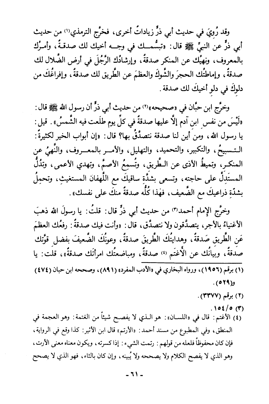 وَقَدْ رُوِيَ فِي حَدِيثِ أَبِي ذَرٍّ زِيَادَاتٌ أُخْرَى، فَخَرَّجَ التِّرْمِذِيُّ مِنْ حَدِيثِ أَبِي ذَرٍّ عَنِ النَّبِيِّ صَلَّى اللَّهُ عَلَيْهِ وَسَلَّمَ قَالَ: " «تَبَسُّمُكَ فِي وَجْهِ أَخِيكَ لَكَ صَدَقَةٌ، وَأَمْرُكَ بِالْمَعْرُوفِ، وَنَهْيُكَ عَنِ الْمُنْكَرِ صَدَقَةٌ، وَإِرْشَادُكَ الرَّجُلَ فِي أَرْضِ الضَّلَالِ لَكَ صَدَقَةٌ، وَإِمَاطَتُكَ الْحَجَرَ وَالشَّوْكَ وَالْعَظْمَ عَنِ الطَّرِيقِ لَكَ صَدَقَةٌ، وَإِفْرَاغُكَ مِنْ دَلْوِكَ فِي دَلْوِ أَخِيكَ لَكَ صَدَقَةٌ» ". وَخَرَّجَ ابْنُ حِبَّانَ فِي " صَحِيحِهِ " مِنْ حَدِيثِ أَبِي ذَرٍّ أَنَّ رَسُولَ اللَّهِ صَلَّى اللَّهُ عَلَيْهِ وَسَلَّمَ قَالَ: «لَيْسَ مِنْ نَفْسِ ابْنِ آدَمَ إِلَّا عَلَيْهَا صَدَقَةٌ فِي كُلِّ يَوْمٍ طَلَعَتْ فِيهِ الشَّمْسُ قِيلَ: يَا رَسُولَ اللَّهِ، وَمِنْ أَيْنَ لَنَا صَدَقَةٌ نَتَصَدَّقُ بِهَا؟ قَالَ: إِنَّ أَبْوَابَ الْجَنَّةِ لَكَثِيرَةٌ: التَّسْبِيحُ، وَالتَّكْبِيرُ، وَالتَّحْمِيدُ، وَالْأَمْرُ بِالْمَعْرُوفِ، وَالنَّهْيُ عَنِ الْمُنْكَرِ، وَتُمِيطُ الْأَذَى عَنِ الطَّرِيقِ، وَتُسْمِعُ الْأَصَمَّ، وَتَهْدِي الْأَعْمَى، وَتَدُلُّ الْمُسْتَدِلَّ عَلَى حَاجَتِهِ، وَتَسْعَى بِشِدَّةِ سَاقَيْكَ مَعَ اللَّهْفَانِ الْمُسْتَغِيثِ، وَتَحْمِلُ بِشِدَّةِ ذِرَاعَيْكَ مَعَ الضَّعِيفِ، فَهَذَا كُلُّهُ صَدَقَةٌ مِنْكَ عَلَى نَفْسِكَ» . وَخَرَّجَ الْإِمَامُ أَحْمَدُ مِنْ حَدِيثِ أَبِي ذَرٍّ قَالَ: «قُلْتُ: يَا رَسُولَ اللَّهِ ذَهَبَ الْأَغْنِيَاءُ بِالْأَجْرِ، يَتَصَدَّقُونَ وَلَا نَتَصَدَّقُ، قَالَ: " وَأَنْتَ فِيكَ صَدَقَةٌ: رَفْعُكَ الْعَظْمَ عَنِ الطَّرِيقِ صَدَقَةٌ، وَهِدَايَتُكَ الطَّرِيقَ صَدَقَةٌ، وَعَوْنُكُ الضَّعِيفَ بِفَضْلِ قُوَّتِكَ صَدَقَةٌ، وَبَيَانُكَ عَنِ الْأَغْتَمِ صَدَقَةٌ، وَمُبَاضَعَتُكَ امْرَأَتَكَ صَدَقَةٌ "، قُلْتُ: يَا