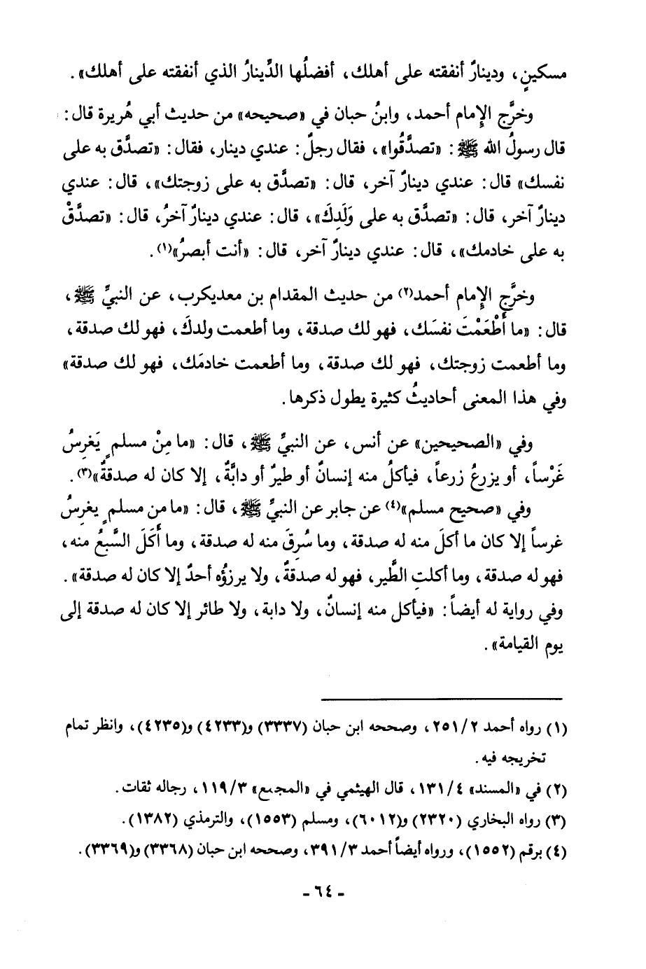 مِسْكِينٍ، وَدِينَارٌ أَنْفَقْتَهُ عَلَى أَهْلِكَ، أَفْضَلُهَا الدِّينَارُ الَّذِي أَنْفَقْتَهُ عَلَى أَهْلِكَ» . وَخَرَّجَ الْإِمَامُ أَحْمَدُ، وَابْنُ حِبَّانَ فِي " صَحِيحِهِ " مِنْ حَدِيثِ أَبِي هُرَيْرَةَ قَالَ: قَالَ رَسُولُ اللَّهِ صَلَّى اللَّهُ عَلَيْهِ وَسَلَّمَ: «تَصَدَّقُوا فَقَالَ رَجُلٌ: عِنْدِي دِينَارٌ، فَقَالَ: " تَصَدَّقْ بِهِ عَلَى نَفْسِكَ " قَالَ عِنْدِي دِينَارٌ آخَرُ، قَالَ: " تَصَدَّقْ بِهِ عَلَى زَوْجَتِكَ " قَالَ: عِنْدِي دِينَارٌ آخَرُ، قَالَ: " تَصَدَّقْ بِهِ عَلَى وَلَدِكَ " قَالَ: عِنْدِي دِينَارٌ آخَرُ، قَالَ: " تَصَدَّقْ بِهِ عَلَى خَادِمِكَ " قَالَ: عِنْدِي دِينَارٌ آخَرُ، قَالَ: أَنْتَ أَبْصَرُ» . وَخَرَّجَ الْإِمَامُ أَحْمَدُ مِنْ حَدِيثِ الْمِقْدَامِ بْنِ مَعْدِي كَرِبَ، عَنِ النَّبِيِّ صَلَّى اللَّهُ عَلَيْهِ وَسَلَّمَ قَالَ: «مَا أَطْعَمْتَ نَفْسَكَ، فَهُوَ لَكَ صَدَقَةٌ، وَمَا أَطْعَمْتَ وَلَدَكَ، فَهُوَ لَكَ صَدَقَةٌ، وَمَا أَطْعَمْتَ زَوْجَتَكَ فَهُوَ لَكَ صَدَقَةٌ، وَمَا أَطْعَمْتَ خَادِمَكَ، فَهُوَ لَكَ صَدَقَةٌ» وَفِي هَذَا الْمَعْنَى أَحَادِيثُ كَثِيرَةٌ يَطُولُ ذِكْرُهَا. وَفِي " الصَّحِيحَيْنِ " عَنْ أَنَسٍ، عَنِ النَّبِيِّ صَلَّى اللَّهُ عَلَيْهِ وَسَلَّمَ، قَالَ: «مَا مِنْ مُسْلِمٍ يَغْرِسُ غَرْسًا، أَوْ يَزْرَعُ زَرْعًا، فَيَأْكُلُ مِنْهُ إِنْسَانٌ أَوْ طَيْرٌ أَوْ دَابَّةٌ، إِلَّا كَانَ لَهُ صَدَقَةٌ» . وَفِي " صَحِيحِ مُسْلِمٍ " عَنْ جَابِرٍ عَنِ النَّبِيِّ صَلَّى اللَّهُ عَلَيْهِ وَسَلَّمَ، قَالَ: «مَا مِنْ مُسْلِمٍ يَغْرِسُ غَرْسًا إِلَّا كَانَ مَا أُكِلَ مِنْهُ لَهُ صَدَقَةٌ، وَمَا سُرِقَ مِنْهُ لَهُ صَدَقَةٌ، وَمَا أَكَلَ السَّبُعُ مِنْهُ، فَهُوَ لَهُ صَدَقَةٌ، وَمَا أَكَلَتِ الطَّيْرُ فَهُوَ لَهُ صَدَقَةٌ، وَلَا يَرْزَؤُهُ أَحَدٌ إِلَّا كَانَ لَهُ صَدَقَةٌ» . وَفِي رِوَايَةٍ لَهُ أَيْضًا: " «فَيَأْكُلُ مِنْهُ إِنْسَانٌ، وَلَا دَابَّةٌ، وَلَا طَائِرٌ إِلَّا كَانَ لَهُ صَدَقَةً إِلَى يَوْمِ الْقِيَامَةِ» ".