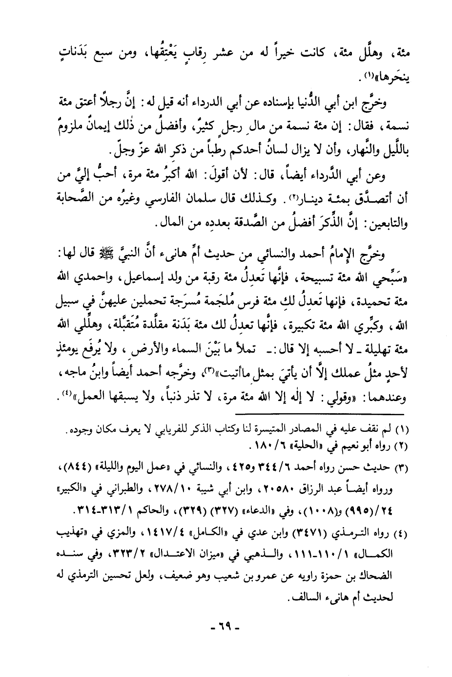 مِائَةً، وَهَلَّلَ مِائَةً، كَانَتْ خَيْرًا لَهُ مِنْ عَشْرِ رِقَابٍ يُعْتِقُهَا، وَمِنْ سَبْعِ بَدَنَاتٍ يَنْحَرُهَا» ". وَخَرَّجَ ابْنُ أَبِي الدُّنْيَا بِإِسْنَادِهِ عَنْ أَبِي الدَّرْدَاءِ أَنَّهُ قِيلَ لَهُ: إِنَّ رَجُلًا أَعْتَقَ مِائَةَ نَسَمَةٍ، فَقَالَ: إِنَّ مِائَةَ نَسَمَةٍ مِنْ مَالِ رَجُلٍ كَثِيرٌ، وَأَفْضَلُ مِنْ ذَلِكَ إِيمَانٌ مَلْزُومٌ بِاللَّيْلِ وَالنَّهَارِ، وَأَنْ لَا يَزَالَ لِسَانُ أَحَدِكُمْ رَطْبًا مِنْ ذِكْرِ اللَّهِ عَزَّ وَجَلَّ. وَعَنْ أَبِي الدَّرْدَاءِ أَيْضًا، قَالَ: لَأَنْ أَقُولَ: اللَّهُ أَكْبَرُ مِائَةَ مَرَّةٍ أَحَبُّ إِلَيَّ مِنْ أَنْ أَتَصَدَّقَ بِمِائَةِ دِينَارٍ. وَكَذَلِكَ قَالَ سَلْمَانُ الْفَارِسِيُّ وَغَيْرُهُ مِنَ الصَّحَابَةِ وَالتَّابِعِينَ: إِنَّ الذِّكْرَ أَفْضَلُ مِنَ الصَّدَقَةِ بِعَدَدِهِ مِنَ الْمَالِ. وَخَرَّجَ الْإِمَامُ أَحْمَدُ وَالنَّسَائِيُّ مِنْ حَدِيثِ أُمِّ هَانِئٍ أَنَّ النَّبِيَّ صَلَّى اللَّهُ عَلَيْهِ وَسَلَّمَ قَالَ لَهَا: «سَبِّحِي اللَّهَ مِائَةَ تَسْبِيحَةٍ، فَإِنَّهَا تَعْدِلُ مِائَةَ رَقَبَةٍ مِنْ وَلَدِ إِسْمَاعِيلَ، وَاحْمَدِي اللَّهَ مِائَةَ تَحْمِيدَةٍ، فَإِنَّهَا تَعْدِلُ لَكِ مِائَةَ فَرَسٍ مُلْجَمَةٍ مُسْرَجَةٍ تَحْمِلِينَ عَلَيْهِنَّ فِي سَبِيلِ اللَّهِ، وَكَبِّرِي اللَّهَ مِائَةَ تَكْبِيرَةٍ، فَإِنَّهَا تَعْدِلُ مِائَةَ بَدَنَةٍ مُقَلَّدَةٍ مُتَقَبَّلَةٍ، وَهَلِّلِي اللَّهَ مِائَةَ تَهْلِيلَةٍ - لَا أَحْسَبُهُ إِلَّا قَالَ: - تَمْلَأُ مَا بَيْنَ السَّمَاءِ وَالْأَرْضِ، وَلَا يُرْفَعُ يَوْمَئِذٍ لِأَحَدٍ مِثْلُ عَمَلِكِ إِلَّا أَنْ يَأْتِيَ بِمِثْلِ مَا أَتَيْتِ» وَخَرَّجَهُ أَحْمَدُ أَيْضًا وَابْنُ مَاجَهْ، وَعِنْدَهُمَا: " «وَقُولِي: لَا إِلَهَ إِلَّا اللَّهُ مِائَةَ مَرَّةٍ، لَا تَذَرُ ذَنْبًا، وَلَا يَسْبِقُهَا الْعَمَلُ» ".