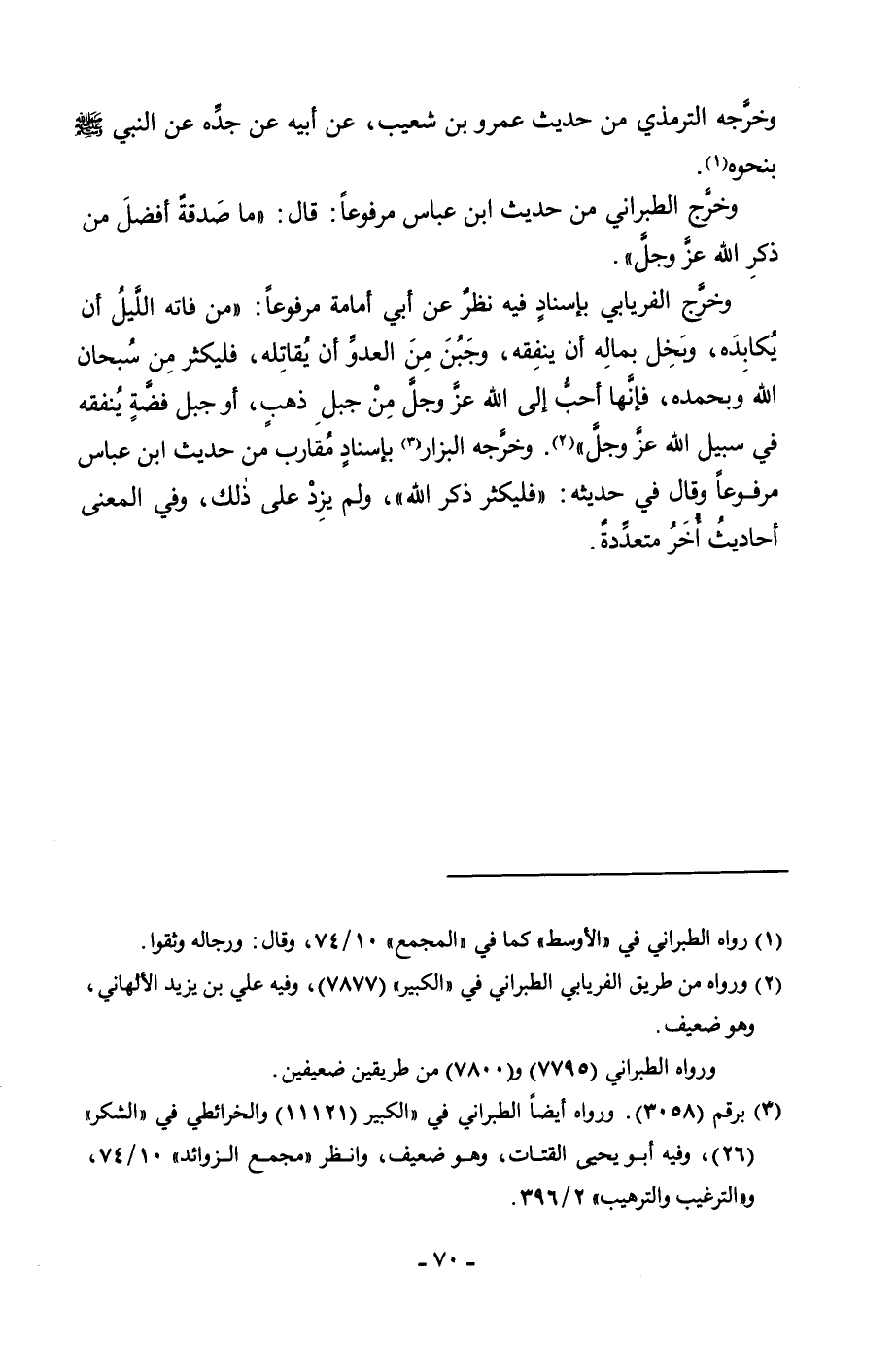 وَخَرَّجَهُ التِّرْمِذِيُّ مِنْ حَدِيثِ عَمْرِو بْنِ شُعَيْبٍ، عَنْ أَبِيهِ عَنْ جَدِّهِ عَنِ النَّبِيِّ صَلَّى اللَّهُ عَلَيْهِ وَسَلَّمَ بِنَحْوِهِ. وَخَرَّجَ الطَّبَرَانِيُّ مِنْ حَدِيثِ ابْنِ عَبَّاسٍ مَرْفُوعًا: قَالَ: " «مَا مِنْ صَدَقَةٍ أَفْضَلُ مِنْ ذِكْرِ اللَّهِ عَزَّ وَجَلَّ» ". وَخَرَّجَ الْفِرْيَابِيُّ بِإِسْنَادٍ فِيهِ نَظَرٌ عَنْ أَبِي أُمَامَةَ مَرْفُوعًا: " «مَنْ فَاتَهُ اللَّيْلُ أَنْ يُكَابِدَهُ، وَيَبْخَلُ بِمَالِهِ أَنْ يُنْفِقَهُ، وَجُبُنَ مِنَ الْعَدْوِ أَنْ يُقَاتِلَهُ، فَلْيُكْثِرْ مِنْ سُبْحَانِ اللَّهِ وَبِحَمْدِهِ، فَإِنَّهَا أَحَبُّ إِلَى اللَّهِ عَزَّ وَجَلَّ مِنْ جَبَلِ ذَهَبٍ، أَوْ جَبَلِ فِضَّةٍ يُنْفِقُهُ فِي سَبِيلِ اللَّهِ عَزَّ وَجَلَّ» ". وَخَرَّجَ الْبَزَّارُ بِإِسْنَادٍ مُقَارِبٍ مِنْ حَدِيثِ ابْنِ عَبَّاسٍ مَرْفُوعًا قَالَ فِي حَدِيثِهِ: " «فَلْيُكْثِرْ ذِكْرَ اللَّهِ» "، وَلَمْ يَزِدْ عَلَى ذَلِكَ، وَفِي الْمَعْنَى أَحَادِيثُ أُخَرُ مُتَعَدِّدَةٌ.
