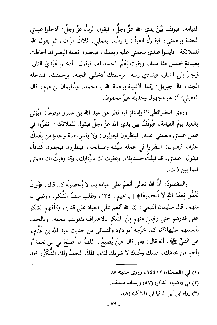 الْقِيَامَةِ، فَيُوقَفُ بَيْنَ يَدَيِ اللَّهِ عَزَّ وَجَلَّ، فَيَقُولُ اللَّهُ عَزَّ وَجَلَّ: أَدَخِلُو عَبْدِي الْجَنَّةَ بِرَحْمَتِي، فَيَقُولُ الْعَبْدُ: يَا رَبِّ، بِعَمَلِي، ثَلَاثَ مَرَّاتٍ، ثُمَّ يَقُولُ اللَّهُ لِلْمَلَائِكَةِ: قَايِسُوا عَبْدِي بِنِعْمَتِي عَلَيْهِ وَبِعَمَلِهِ، فَيَجِدُونَ نِعْمَةَ الْبَصَرِ قَدْ أَحَاطَتْ بِعِبَادَةِ خَمْسِمِائَةِ سَنَةٍ، وَبَقِيَتْ نِعَمُ الْجَسَدِ لَهُ، فَيَقُولُ: أَدْخَلُوا عَبْدِي النَّارَ، فَيُجَرُّ إِلَى النَّارِ، فَيُنَادِي رَبَّهُ: بِرَحْمَتِكَ أَدْخِلْنِي الْجَنَّةَ، بِرَحْمَتِكَ أَدْخِلْنِي الْجَنَّةَ، فَيُدْخِلُهُ الْجَنَّةَ، قَالَ جِبْرِيلُ: إِنَّمَا الْأَشْيَاءُ بِرَحْمَةِ اللَّهِ يَا مُحَمَّدُ» . وَسَلْمَانُ بْنُ هَرِمٍ، قَالَ الْعُقَيْلِيُّ: هُوَ مَجْهُولٌ وَحَدِيثُهُ غَيْرُ مَحْفُوظٍ. وَرَوَى الْخَرَائِطِيُّ بِإِسْنَادٍ فِيهِ نَظَرٌ عَنْ عَبْدِ اللَّهِ بْنِ عَمْرٍو مَرْفُوعًا: «يُؤْتَى بِالْعَبْدِ يَوْمَ الْقِيَامَةِ، فَيُوقِفُ بَيْنَ يَدَيِ اللَّهِ عَزَّ وَجَلَّ فَيَقُولُ لِلْمَلَائِكَةِ: انْظُرُوا فِي عَمَلِ عَبْدِي وَنِعْمَتِي عَلَيْهِ، فَيَنْظُرُونَ فَيَقُولُونَ: وَلَا بِقَدْرِ نِعْمَةٍ وَاحِدَةٍ مِنْ نِعَمِكَ عَلَيْهِ، فَيَقُولُ: انْظُرُوا فِي عَمَلِهِ سَيِّئِهِ وَصَالِحِهِ، فَيَنْظُرُونَ فَيَجِدُونَهُ كَفَافًا، فَيَقُولُ: عَبْدِي، قَدْ قَبِلْتُ حَسَنَاتِكَ، وَغَفَرْتُ لَكَ سَيِّئَاتِكَ، وَقَدْ وَهَبْتُ لَكَ نِعْمَتِي فِيمَا بَيْنَ ذَلِكَ» . وَالْمَقْصُودُ: أَنَّ اللَّهَ تَعَالَى أَنْعَمَ عَلَى عِبَادِهِ بِمَا لَا يُحْصُونَهُ كَمَا قَالَ: {وَإِنْ تَعُدُّوا نِعْمَةَ اللَّهِ لَا تُحْصُوهَا} [إبراهيم: 34] [إِبْرَاهِيمَ: 34] وَطَلَبَ مِنْهُمُ الشُّكْرَ، وَرَضِيَ بِهِ مِنْهُمْ. قَالَ سُلَيْمَانُ التَّيْمِيُّ: إِنَّ اللَّهَ أَنْعَمَ عَلَى الْعِبَادِ عَلَى قَدْرِهِ، وَكَلَّفَهُمُ الشُّكْرَ عَلَى قَدْرِهِمْ حَتَّى رَضِيَ مِنْهُمْ مِنَ الشُّكْرِ بِالِاعْتِرَافِ بِقُلُوبِهِمْ بِنِعَمِهِ، وَبِالْحَمْدِ بِأَلْسِنَتِهِمْ عَلَيْهَا، كَمَا خَرَّجَهُ أَبُو دَاوُدَ وَالنِّسَائِيُّ مِنْ حَدِيثِ عَبْدِ اللَّهِ بْنِ غَنَّامٍ، عَنِ النَّبِيِّ صَلَّى اللَّهُ عَلَيْهِ وَسَلَّمَ، أَنَّهُ قَالَ «مَنْ قَالَ: حِينَ يُصْبِحُ: اللَّهُمَّ مَا أَصْبَحَ بِي مِنْ نِعْمَةٍ أَوْ بِأَحَدٍ مِنْ خَلْقِكَ، فَمِنْكَ وَحْدَكَ لَا شَرِيكَ لَكَ، فَلَكَ الْحَمْدُ وَلَكَ الشُّكْرُ، فَقَدَ