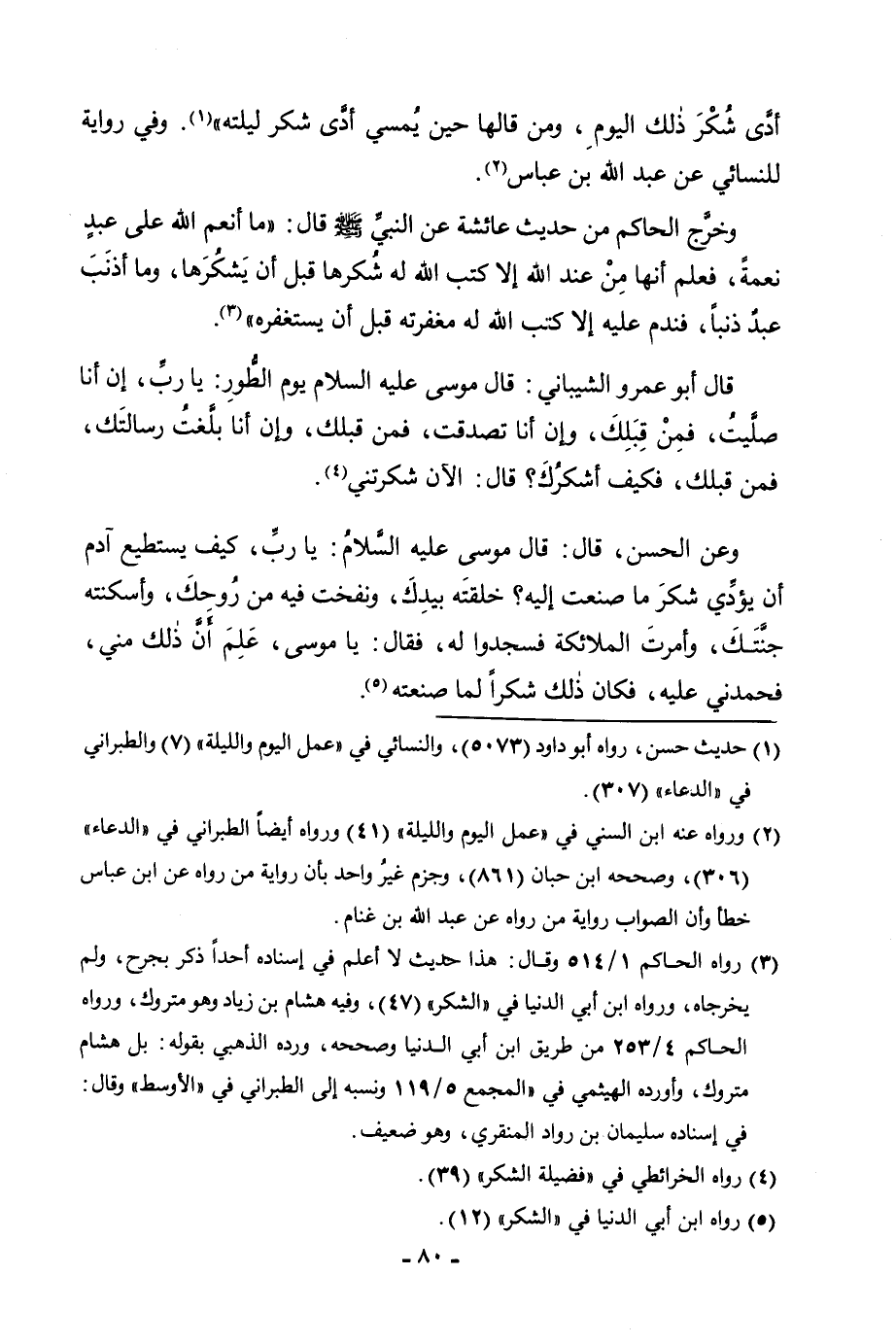 أَدَّى شُكْرَ ذَلِكَ الْيَوْمِ، وَمَنْ قَالَهَا حِينَ يُمْسِي أَدَّى شُكْرَ لَيْلَتِهِ» . وَفِي رِوَايَةِ النَّسَائِيِّ عَنْ عَبْدِ اللَّهِ بْنِ عَبَّاسٍ. وَخَرَّجَ الْحَاكِمُ مِنْ حَدِيثِ عَائِشَةَ عَنِ النَّبِيِّ صَلَّى اللَّهُ عَلَيْهِ وَسَلَّمَ قَالَ: «مَا أَنْعَمَ اللَّهُ عَلَى عَبْدٍ نِعْمَةً، فَعَلِمَ أَنَّهَا مِنْ عِنْدِ اللَّهِ إِلَّا كَتَبَ اللَّهُ شُكْرَهَا قَبْلَ أَنْ يَشْكُرَهَا، وَمَا أَذْنَبَ عَبْدٌ ذَنْبًا، فَنَدِمَ عَلَيْهِ إِلَّا كَتَبَ اللَّهُ لَهُ مَغْفِرَتَهُ قَبْلَ أَنْ يَسْتَغْفِرَهُ» . وَقَالَ أَبُو عَمْرٍو الشَّيْبَانِيُّ: قَالَ مُوسَى عَلَيْهِ السَّلَامُ يَوْمَ الطُّورِ: يَا رَبِّ، إِنْ أَنَا صَلَّيْتُ فَمِنْ قِبَلِكَ، وَإِنْ أَنَا تَصَدَّقْتُ فَمِنْ قِبَلِكَ، وَإِنْ أَنَا بَلَّغْتُ رِسَالَتَكَ فَمِنْ قِبَلِكَ، فَكَيْفَ أَشْكُرُكَ؟ قَالَ: الْآنَ شَكَرْتَنِي. وَعَنِ الْحَسَنِ قَالَ: قَالَ مُوسَى عَلَيْهِ السَّلَامُ: يَا رَبِّ، كَيْفَ يَسْتَطِيعُ آدَمُ أَنْ يُؤَدِّيَ شُكْرَ مَا صَنَعْتَ إِلَيْهِ؟ خَلَقْتَهُ بِيَدِكَ، وَنَفَخْتَ فِيهِ مِنْ رُوحِكَ، وَأَسْكَنْتَهُ جَنَّتَكَ، وَأَمَرْتَ الْمَلَائِكَةَ فَسَجَدُوا لَهُ، فَقَالَ: يَا مُوسَى، عَلِمَ أَنَّ ذَلِكَ مِنِّي، فَحَمِدَنِي عَلَيْهِ، فَكَانَ ذَلِكَ شُكْرًا لِمَا صَنَعْتُهُ.