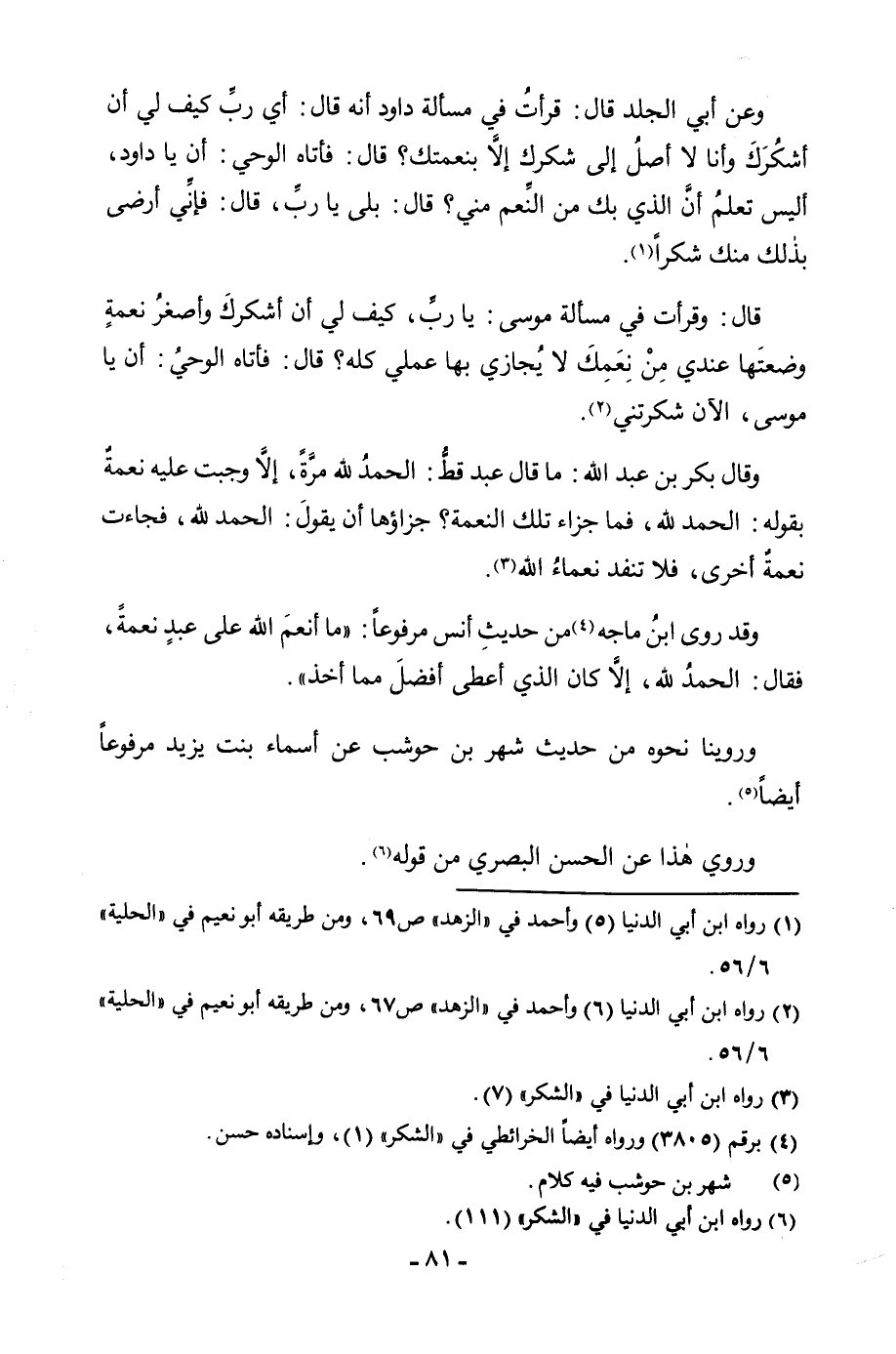 وَعَنْ أَبِي الْجِلْدِ قَالَ: قَرَأْتُ فِي مَسْأَلَةِ دَاوُدَ أَنَّهُ قَالَ: أَيْ رَبِّ كَيْفَ لِي أَنْ أَشْكُرَكَ وَأَنَا لَا أَصِلُ إِلَى شُكْرِكَ إِلَّا بِنِعْمَتِكَ؟ قَالَ: فَأَتَاهُ الْوَحْيُ: أَنْ يَا دَاوُدُ، أَلَيْسَ تَعْلَمُ أَنَّ الَّذِي بِكَ مِنَ النِّعَمِ مِنِّي؟ قَالَ: بَلَى يَا رَبِّ، قَالَ: فَإِنِّي أَرْضَى بِذَلِكَ مِنْكَ شُكْرًا. قَالَ: وَقَرَأْتُ فِي مَسْأَلَةِ مُوسَى: يَا رَبِّ، كَيْفَ لِي أَنْ أَشْكُرَكَ وَأَصْغَرُ نِعْمَةٍ وَضَعْتَهَا عِنْدِي مِنْ نِعَمِكَ لَا يُجَازِي بِهَا عَمَلِي كُلُّهُ؟ قَالَ: فَأَتَاهُ الْوَحْيُ: أَنْ يَا مُوسَى، الْآنَ شَكَرْتَنِي. وَقَالَ بَكْرُ بْنُ عَبْدِ اللَّهِ مَا قَالَ: عَبْدٌ قَطُّ: الْحَمْدُ لِلَّهِ مَرَّةً، إِلَّا وَجَبَتْ عَلَيْهِ نِعْمَةٌ بِقَوْلِهِ: الْحَمْدُ لِلَّهِ، فَمَا جَزَاءُ تِلْكَ النِّعْمَةِ؟ جَزَاؤُهَا أَنْ يَقُولَ: الْحَمْدُ لِلَّهِ، فَجَاءَتْ نِعْمَةٌ أُخْرَى، فَلَا تَنْفَدُ نَعْمَاءُ اللَّهِ. وَقَدْ رَوَى ابْنُ مَاجَهْ مِنْ حَدِيثِ أَنَسٍ مَرْفُوعًا: «مَا أَنْعَمَ اللَّهُ عَلَى عَبْدٍ نِعْمَةً، فَقَالَ: الْحَمْدُ لِلَّهِ، إِلَّا كَانَ الَّذِي أُعْطِيَ أَفْضَلَ مِمَّا أَخَذَ» . وَرُوِّينَا نَحْوُهُ مِنْ حَدِيثِ شَهْرِ بْنِ حَوْشَبٍ عَنْ أَسْمَاءَ بِنْتِ يَزِيدَ مَرْفُوعًا أَيْضًا. وَرُوِيَ هَذَا عَنِ الْحَسَنِ الْبَصْرِيِّ مِنْ قَوْلِهِ.