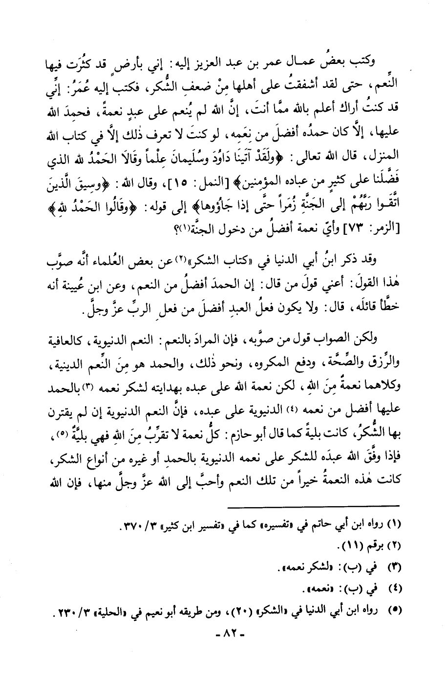 وَكَتَبَ بَعْضُ عُمَّالِ عُمَرَ بْنِ عَبْدِ الْعَزِيزِ إِلَيْهِ: إِنِّي بِأَرْضٍ قَدْ كَثُرَتْ فِيهَا النِّعَمُ، حَتَّى لَقَدْ أَشْفَقْتُ عَلَى أَهْلِهَا مِنْ ضَعْفِ الشُّكْرِ، فَكَتَبَ إِلَيْهِ عُمَرُ: إِنِّي قَدْ كُنْتُ أَرَاكَ أَعْلَمُ بِاللَّهِ مِمَّا أَنْتَ، إِنِ اللَّهَ لَمْ يُنْعِمْ عَلَى عَبْدٍ نِعْمَةً فَحَمِدَ اللَّهَ عَلَيْهَا، إِلَّا كَانَ حَمْدُهُ أَفْضَلَ مِنْ نِعْمَتِهِ، لَوْ كُنْتَ لَا تَعْرِفُ ذَلِكَ إِلَّا فِي كِتَابِ اللَّهِ الْمُنْزَلِ، قَالَ اللَّهُ تَعَالَى: {وَلَقَدْ آتَيْنَا دَاوُدَ وَسُلَيْمَانَ عِلْمًا وَقَالَا الْحَمْدُ لِلَّهِ الَّذِي فَضَّلَنَا عَلَى كَثِيرٍ مِنْ عِبَادِهِ الْمُؤْمِنِينَ} [النمل: 15] [النَّمْلِ: 15] ، وَقَالَ اللَّهُ: {وَسِيقَ الَّذِينَ اتَّقَوْا رَبَّهُمْ إِلَى الْجَنَّةِ زُمَرًا حَتَّى إِذَا جَاءُوهَا} [الزمر: 73] إِلَى قَوْلِهِ: {وَقَالُوا الْحَمْدُ لِلَّهِ} [الزمر: 74] [الزُّمَرِ: 73] وَأَيُّ نِعْمَةٍ أَفْضَلُ مِنْ دُخُولِ الْجَنَّةِ؟ . وَقَدْ ذَكَرَ ابْنُ أَبِي الدُّنْيَا فِي " كِتَابِ الشُّكْرِ " عَنْ بَعْضِ الْعُلَمَاءِ أَنَّهُ صَوَّبَ هَذَا الْقَوْلَ، أَعْنِي قَوْلَ مَنْ قَالَ: إِنَّ الْحَمْدَ أَفْضَلُ مِنَ النِّعَمِ، وَعَنِ ابْنِ عُيَيْنَةَ أَنَّهُ خَطَّأَ قَائِلَهُ، وَقَالَ: لَا يَكُونُ فِعْلُ الْعَبْدِ أَفْضَلَ مِنْ فِعْلِ الرَّبِّ عَزَّ وَجَلَّ. وَلَكِنَّ الصَّوَابَ قَوْلُ مَنْ صَوَّبَهُ، فَإِنَّ الْمُرَادَ بِالنِّعَمِ: النِّعَمُ الدُّنْيَوِيَّةُ، كَالْعَافِيَةِ وَالرِّزْقِ وَالصِّحَّةِ، وَدَفْعِ الْمَكْرُوهِ، وَنَحْوِ ذَلِكَ، وَالْحَمْدُ لِلَّهِ هُوَ مِنَ النِّعَمِ الدِّينِيَّةِ، وَكُلَاهُمَا نِعْمَةٌ مِنَ اللَّهِ، لَكِنَّ نِعْمَةَ اللَّهِ عَلَى عَبْدِهِ بِهِدَايَتِهِ لِشُكْرِ نِعَمِهِ بِالْحَمْدِ عَلَيْهَا أَفْضَلُ مِنْ نِعَمِهِ الدُّنْيَوِيَّةِ عَلَى عَبْدِهِ، فَإِنَّ النِّعَمَ الدُّنْيَوِيَّةَ إِنْ لَمْ يَقْتَرِنْ بِهَا الشُّكْرُ، كَانَتْ بَلِيَّةً كَمَا قَالَ أَبُو حَازِمٍ: كُلُّ نِعْمَةٍ لَا تُقَرِّبُ مِنَ اللَّهِ فَهِيَ بَلِيَّةٌ، فَإِذَا وَفَّقَ اللَّهُ عَبْدَهُ لِلشُّكْرِ عَلَى نِعَمِهِ الدُّنْيَوِيَّةِ بِالْحَمْدِ أَوْ غَيْرِهِ مِنْ أَنْوَاعِ الشُّكْرِ، كَانَتْ هَذِهِ النِّعْمَةُ خَيْرًا مِنْ تِلْكَ النِّعَمِ وَأَحَبَّ إِلَى اللَّهِ عَزَّ وَجَلَّ مِنْهَا، فَإِنَّ اللَّهَ