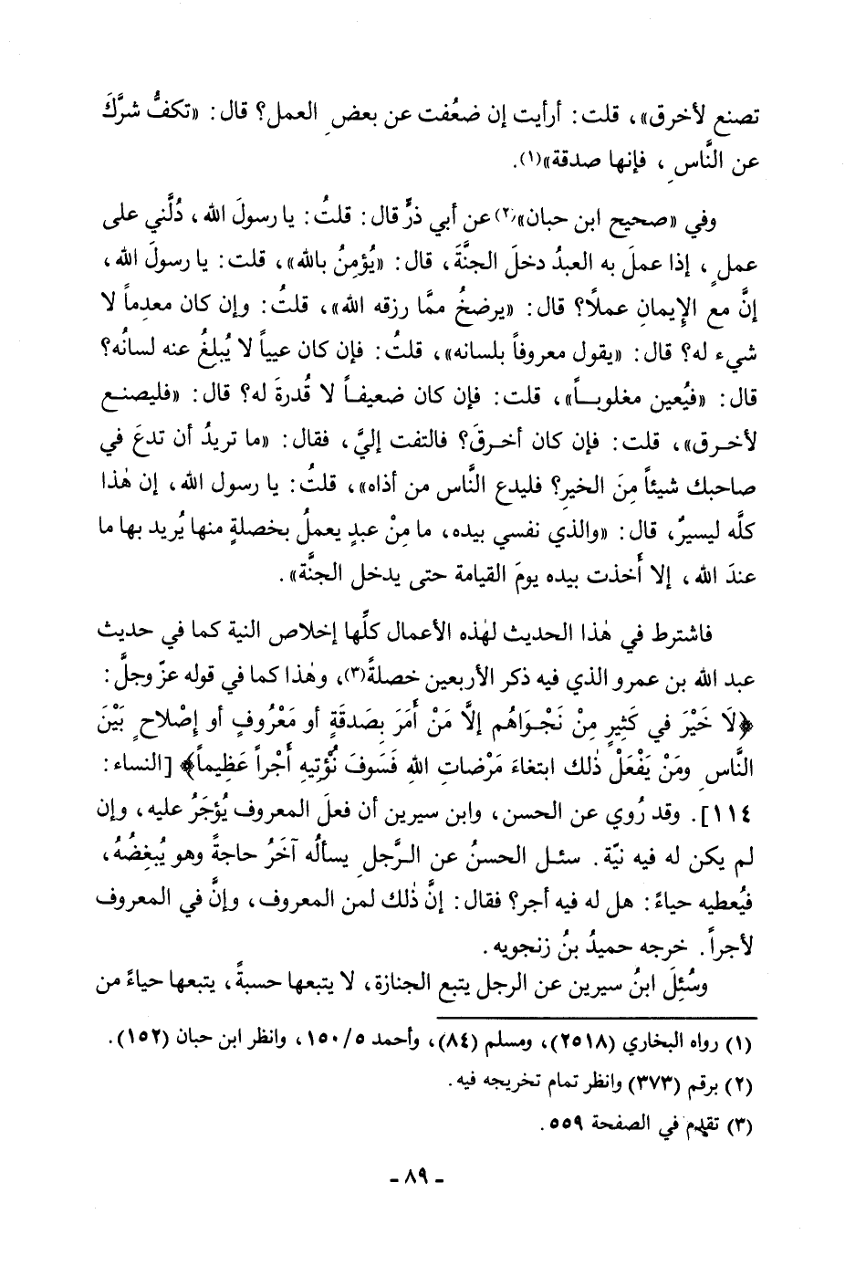 تَصْنَعُ لِأَخْرَقَ قُلْتُ: أَرَأَيْتَ إِنْ ضَعُفْتُ عَنْ بَعْضِ الْعَمَلِ؟ قَالَ: تَكُفُّ شَرَّكَ عَنِ النَّاسِ، فَإِنَّهَا صَدَقَةٌ» . وَفِي " صَحِيحِ ابْنِ حِبَّانِ " «عَنْ أَبِي ذَرٍّ قَالَ: قُلْتُ: يَا رَسُولَ اللَّهِ، دُلَّنِي عَلَى عَمَلٍ، إِذَا عَمِلَ بِهِ الْعَبْدُ دَخَلَ بِهِ الْجَنَّةَ، قَالَ: يُؤْمِنُ بِاللَّهِ قُلْتُ: يَا رَسُولَ اللَّهِ، إِنَّ مَعَ الْإِيمَانِ عَمَلًا؟ قَالَ: يَرْضَخُ مِمَّا رَزَقَهُ اللَّهُ قُلْتُ: وَإِنْ كَانَ مُعْدَمًا لَا شَيْءَ لَهُ؟ قَالَ: يَقُولُ مَعْرُوفًا بِلِسَانِهِ، قُلْتُ: فَإِنْ كَانَ عَيِيًّا لَا يُبْلِغُ عَنْهُ لِسَانُهُ؟ قَالَ: فَيُعِينُ مَغْلُوبًا، قُلْتُ: فَإِنْ كَانَ ضَعِيفًا لَا قُدْرَةَ لَهُ؟ قَالَ: فَلْيَصْنَعْ لِأَخْرَقَ، قُلْتُ: فَإِنْ كَانَ أَخْرَقَ؟ فَالْتَفَتَ إِلَيَّ، فَقَالَ: مَا تُرِيدُ أَنْ تَدَعَ فِي صَاحِبِكَ شَيْئًا مِنَ الْخَيْرِ؟ فَلْيَدْعِ النَّاسَ مِنْ أَذَاهُ، قُلْتُ: يَا رَسُولَ اللَّهِ، إِنَّ هَذَا كُلُّهُ لَيَسِيرٌ، قَالَ: وَالَّذِي نَفْسِي بِيَدِهِ، مَا مِنْ عَبْدٍ يَعْمَلُ بِخَصْلَةٍ مِنْهَا يُرِيدُ بِهَا مَا عِنْدَ اللَّهِ، إِلَّا أَخَذَتْ بِيَدِهِ يَوْمَ الْقِيَامَةِ حَتَّى يَدْخُلَ الْجَنَّةَ» . فَاشْتَرَطَ فِي هَذَا الْحَدِيثِ لِهَذِهِ الْأَعْمَالِ كُلِّهَا إِخْلَاصَ النِّيَّةِ كَمَا فِي حَدِيثِ عَبْدِ اللَّهِ بْنِ عَمْرٍو الَّذِي فِيهِ ذِكْرُ الْأَرْبَعِينَ خَصْلَةً، وَهَذَا كَمَا فِي قَوْلِهِ عَزَّ وَجَلَّ: {لَا خَيْرَ فِي كَثِيرٍ مِنْ نَجْوَاهُمْ إِلَّا مَنْ أَمَرَ بِصَدَقَةٍ أَوْ مَعْرُوفٍ أَوْ إِصْلَاحٍ بَيْنَ النَّاسِ وَمَنْ يَفْعَلْ ذَلِكَ ابْتِغَاءَ مَرْضَاةِ اللَّهِ فَسَوْفَ نُؤْتِيهِ أَجْرًا عَظِيمًا} [النساء: 114] [النِّسَاءِ: 114] . وَقَدْ رُوِيَ عَنِ الْحَسَنِ، وَابْنِ سِيرِينَ أَنَّ فِعْلَ الْمَعْرُوفِ يُؤْجَرُ عَلَيْهِ، وَإِنْ لَمْ يَكُنْ لَهُ فِيهِ نِيَّةٌ. سُئِلَ الْحَسَنُ عَنِ الرَّجُلِ يَسْأَلُهُ آخَرُ حَاجَةً وَهُوَ يُبْغِضُهُ، فَيُعْطِيهُ حَيَاءً: هَلْ لَهُ فِيهِ أَجْرٌ؟ فَقَالَ: إِنَّ ذَلِكَ لَمِنَ الْمَعْرُوفِ، وَإِنَّ فِي الْمَعْرُوفِ لَأَجْرًا. خَرَّجَهُ حُمَيْدُ بْنُ زِنْجَوَيْهِ. وَسُئِلَ ابْنُ سِيرِينَ عَنِ الرَّجُلِ يَتْبَعُ الْجِنَازَةَ، لَا يَتْبَعُهَا حِسْبَةً، يَتْبَعُهَا حَيَاءً مِنْ