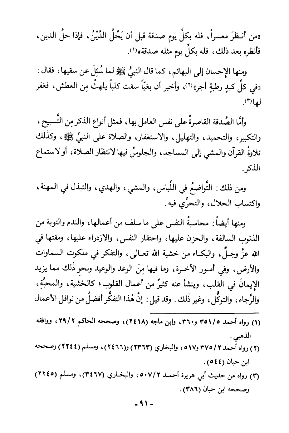 «مَنْ أَنْظَرَ مُعْسِرًا، فَلَهُ بِكُلِّ يَوْمٍ صَدَقَةٌ، قَبْلَ أَنْ يَحُلَّ الدَّيْنُ، فَإِذَا حَلَّ الدَّيْنُ، فَأَنْظَرَهُ بَعْدَ ذَلِكَ، فَلَهُ بِكُلِّ يَوْمٍ مِثْلِهِ صَدَقَةٌ» . وَمِنْهَا الْإِحْسَانُ إِلَى الْبَهَائِمِ، كَمَا قَالَ النَّبِيُّ صَلَّى اللَّهُ عَلَيْهِ وَسَلَّمَ لَمَّا سُئِلَ عَنْ سَقْيِهَا: فَقَالَ: «فِي كُلِّ كَبِدٍ رَطْبَةٍ أَجْرٌ» ، وَأَخْبَرَ أَنَّ «بَغِيًّا سَقَتْ كَلْبًا يَلْهَثُ مِنَ الْعَطَشِ، فَغُفِرَ لَهَا» . وَأَمَّا الصَّدَقَةُ الْقَاصِرَةُ عَلَى نَفْسِ الْعَامِلِ بِهَا، فَمِثْلُ أَنْوَاعِ الذِّكْرِ مِنَ التَّسْبِيحِ، وَالتَّكْبِيرِ، وَالتَّحْمِيدِ، وَالتَّهْلِيلِ، وَالِاسْتِغْفَارِ، وَالصَّلَاةِ عَلَى النَّبِيِّ صَلَّى اللَّهُ عَلَيْهِ وَسَلَّمَ، وَكَذَلِكَ تِلَاوَةُ الْقُرْآنِ، وَالْمَشْيُ إِلَى الْمَسَاجِدِ، وَالْجُلُوسُ فِيهَا لِانْتِظَارِ الصَّلَاةِ، أَوْ لِاسْتِمَاعِ الذِّكْرِ. وَمِنْ ذَلِكَ: التَّوَاضُعُ فِي اللِّبَاسِ، وَالْمَشْيُ، وَالْهَدْيُ، وَالتَّبَذُّلُ فِي الْمِهْنَةِ، وَاكْتِسَابُ الْحَلَالِ، وَالتَّحَرِّي فِيهِ. وَمِنْهَا أَيْضًا: مُحَاسَبَةُ النَّفْسِ عَلَى مَا سَلَفَ مِنْ أَعْمَالِهَا، وَالنَّدَمُ وَالتَّوْبَةُ مِنَ الذُّنُوبِ السَّالِفَةِ، وَالْحُزْنُ عَلَيْهَا، وَاحْتِقَارُ النَّفْسِ، وَالِازْدِرَاءُ عَلَيْهَا، وَمَقْتُهَا فِي اللَّهِ عَزَّ وَجَلَّ، وَالْبُكَاءُ مِنْ خَشْيَةِ اللَّهِ تَعَالَى، وَالتَّفَكُّرُ فِي مَلَكُوتِ السَّمَاوَاتِ وَالْأَرْضِ، وَفِي أُمُورِ الْآخِرَةِ، وَمَا فِيهَا مِنَ الْوَعْدِ وَالْوَعِيدِ وَنَحْوِ ذَلِكَ مِمَّا يُزِيدُ الْإِيمَانَ فِي الْقَلْبِ، وَيَنْشَأُ عَنْهُ كَثِيرٌ مِنْ أَعْمَالِ الْقُلُوبِ؛ كَالْخَشْيَةِ، وَالْمَحَبَّةِ، وَالرَّجَاءِ، وَالتَّوَكُّلِ، وَغَيْرِ ذَلِكَ. وَقَدْ قِيلَ: إِنَّ هَذَا التَّفَكُّرَ أَفْضَلُ مِنْ نَوَافِلِ الْأَعْمَالِ