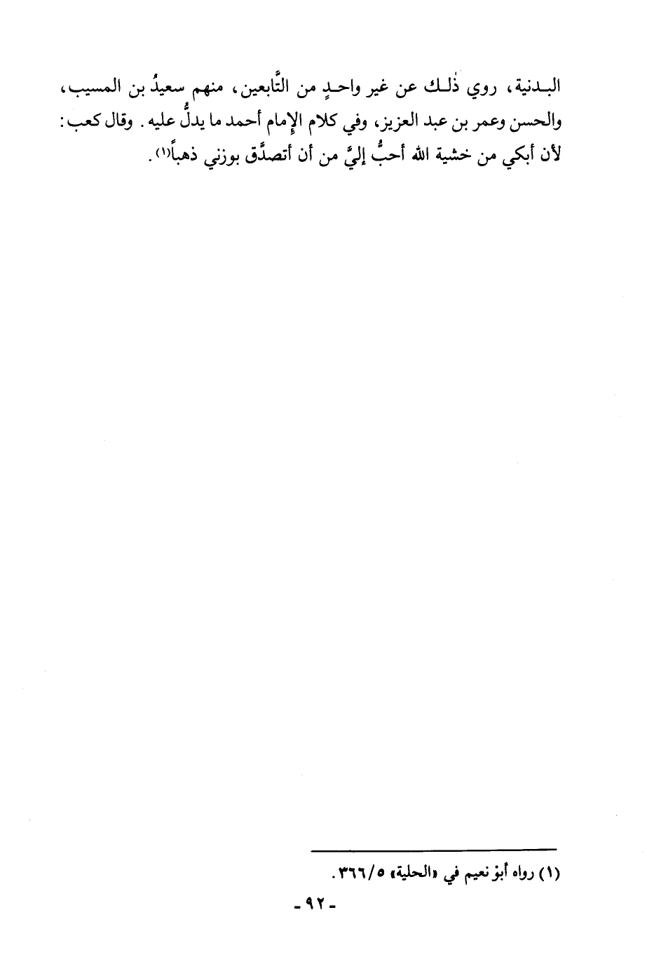 الْبَدَنِيَّةِ، رُوِيَ ذَلِكَ عَنْ غَيْرِ وَاحِدٍ مِنَ التَّابِعِينَ، مِنْهُمْ سَعِيدُ بْنُ الْمُسَيَّبِ، وَالْحَسَنُ وَعُمَرُ بْنُ عَبْدِ الْعَزِيزِ، وَفِي كَلَامِ الْإِمَامِ أَحْمَدَ مَا يَدُلُّ عَلَيْهِ. وَقَالَ كَعْبٌ: لَأَنْ أَبْكِيَ مِنْ خَشْيَةِ اللَّهِ أَحَبُّ إِلَيَّ مِنْ أَنْ أَتَصَدَّقَ بِوَزْنِي ذَهَبًا.