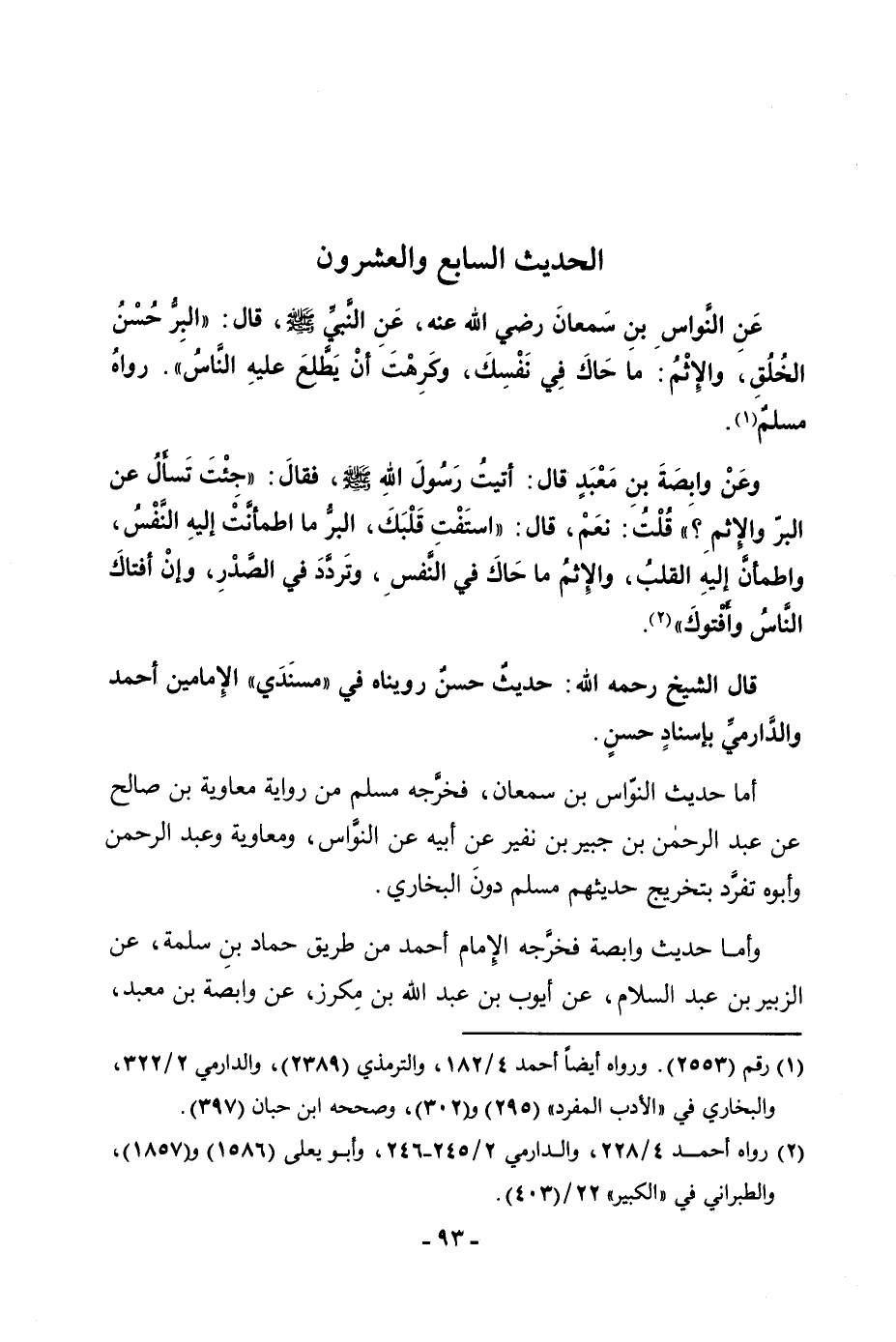 عَنِ النَّوَّاسِ بْنِ سَمْعَانَ الْأَنْصَارِيِّ قَالَ: «سَأَلْتُ رَسُولَ اللَّهِ صَلَّى اللَّهُ عَلَيْهِ وَسَلَّمَ عَنِ الْبِرِّ وَالْإِثْمِ، فَقَالَ: الْبِرُّ حُسْنُ الْخُلُقِ، وَالْإِثْمُ مَا حَاكَ فِي صَدْرِكَ وَكَرِهْتَ أَنْ يَطَّلِعَ عَلَيْهِ النَّاسُ» رَوَاهُ مُسْلِمٌ.