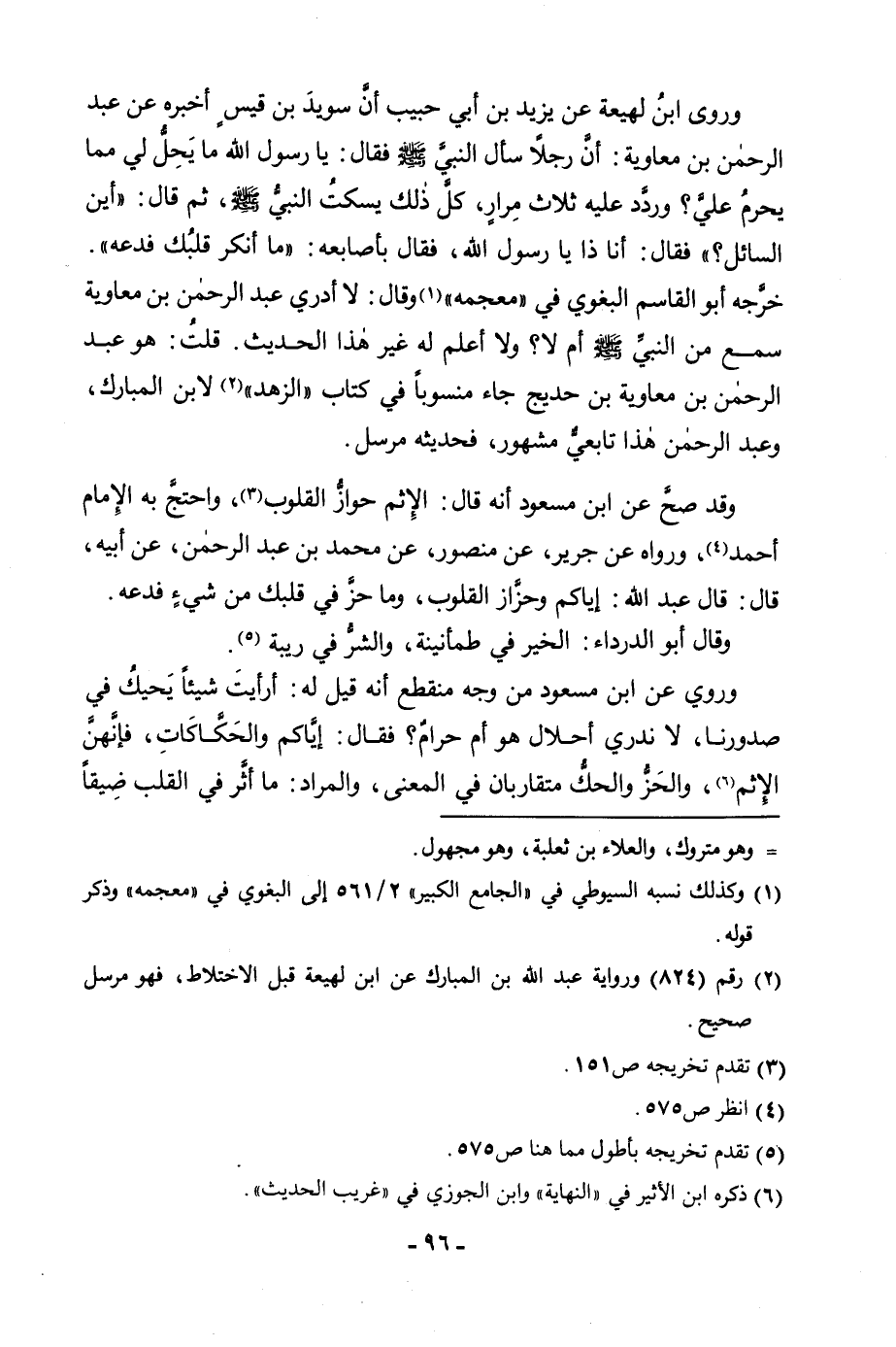 وَرَوَى ابْنُ لَهِيعَةَ عَنْ يَزِيدَ بْنِ أَبِي حَبِيبٍ أَنَّ سُوِيدَ بْنَ قَيْسٍ أَخْبَرَهُ عَنْ عَبْدِ الرَّحْمَنِ بْنِ مُعَاوِيَةَ: «أَنَّ رَجُلًا سَأَلَ النَّبِيَّ صَلَّى اللَّهُ عَلَيْهِ وَسَلَّمَ فَقَالَ: يَا رَسُولَ اللَّهِ مَا يَحِلُّ لِي مِمَّا يَحْرُمُ عَلَيَّ؟ وَرَدَّدَ عَلَيْهِ ثَلَاثَ مِرَارٍ، كُلُّ ذَلِكَ يَسْكُتُ النَّبِيُّ صَلَّى اللَّهُ عَلَيْهِ وَسَلَّمَ، ثُمَّ قَالَ: أَيْنَ السَّائِلُ؟ فَقَالَ: أَنَا ذَا يَا رَسُولَ اللَّهِ، فَقَالَ بِأَصَابِعِهِ: مَا أَنْكَرَ قَلْبُكُ فَدَعْهُ» . خَرَّجَهُ أَبُو الْقَاسِمِ الْبَغَوِيُّ فِي " مُعْجَمِهِ " وَقَالَ: لَا أَدْرِي عَبْدُ الرَّحْمَنِ بْنُ مُعَاوِيَةَ سَمِعَ مِنَ النَّبِيِّ صَلَّى اللَّهُ عَلَيْهِ وَسَلَّمَ أَمْ لَا؟ وَلَا أَعْلَمُ لَهُ غَيْرَ هَذَا الْحَدِيثِ. قُلْتُ: هُوَ عَبْدُ الرَّحْمَنِ بْنُ مُعَاوِيَةَ بْنِ حُدَيْجٍ جَاءَ مَنْسُوبًا فِي كِتَابِ " الزُّهْدِ " لِابْنِ الْمُبَارَكِ، وَعَبْدُ الرَّحْمَنِ هَذَا تَابِعِيٌّ مَشْهُورٌ، فَحَدِيثُهُ مُرْسَلٌ.