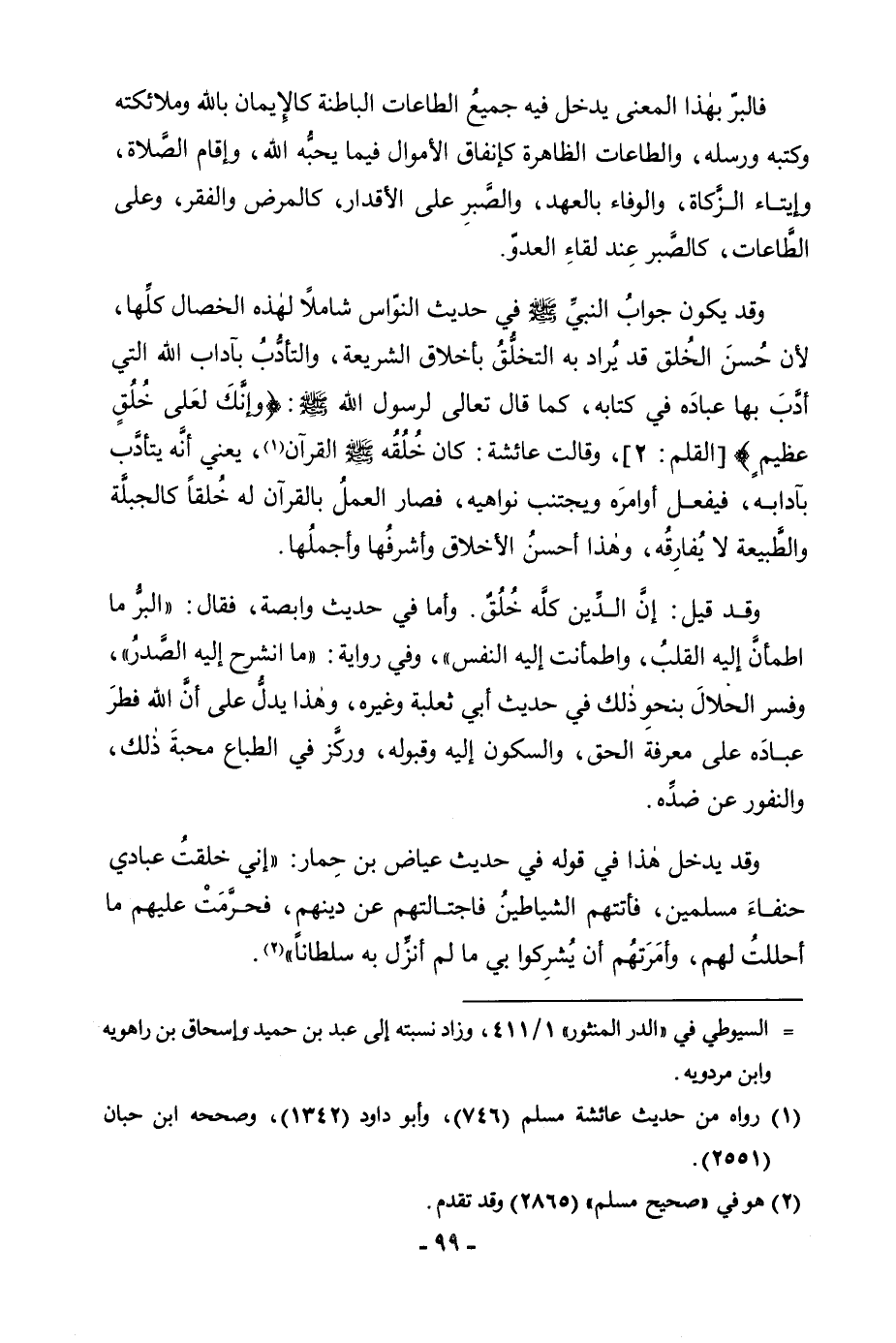 وَقَدْ يَكُونُ جَوَابُ النَّبِيِّ صَلَّى اللَّهُ عَلَيْهِ وَسَلَّمَ فِي حَدِيثِ النَّوَّاسِ شَامِلًا لِهَذِهِ الْخِصَالِ كُلِّهَا، لِأَنَّ حُسْنَ الْخُلُقِ قَدْ يُرَادُ بِهِ التَّخَلُّقُ بِأَخْلَاقِ الشَّرِيعَةِ، وَالتَّأَدُّبُ بِآدَابِ اللَّهِ الَّتِي أَدَبَّ بِهَا عِبَادَهُ فِي كِتَابِهِ، كَمَا قَالَ تَعَالَى لِرَسُولِهِ {وَإِنَّكَ لَعَلَى خُلُقٍ عَظِيمٍ} [القلم: 4] [الْقَلَمِ: 4] ، «وَقَالَتْ عَائِشَةُ: كَانَ خُلُقُهُ صَلَّى اللَّهُ عَلَيْهِ وَسَلَّمَ الْقُرْآنَ» ، يَعْنِي أَنَّهُ يَتَأَدَّبُ بِآدَابِهِ، فَيَفْعَلُ أَوَامِرَهُ، وَيَتَجَنَّبُ نَوَاهِيَهُ، فَصَارَ الْعَمَلُ بِالْقُرْآنِ لَهُ خُلُقًا كَالْجِبِلَّةِ وَالطَّبِيعَةِ لَا يُفَارِقُهُ، وَهَذَا أَحْسَنُ الْأَخْلَاقِ وَأَشْرَفُهَا وَأَجْمَلُهَا.