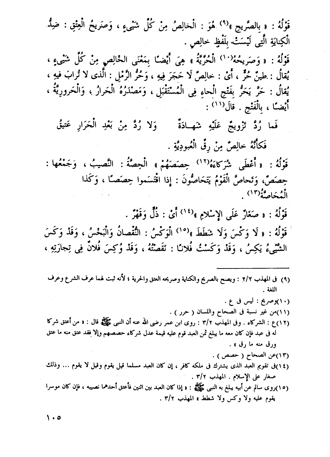قَوْلُهُ: "وَصَريحُهُ (¬10) الْحُرِّيَّةُ" هِىَ أَيْضًا بِمَعْنَى الخالِصِ مِنْ كْلِّ شَيْىءٍ، يُقالُ: طينٌ حُرٌّ، أَىْ: خالِصٌ لَا حَجَرَ فِيهِ، وَحُرُّ الرَّمْلِ: الَّذى لا تُرابَ فيهِ، يُقالُ: حَرَّ يَحَرُّ بِفَتْحِ الْحاءِ فِى المُسْتَقْبَلِ، وَمَصْدَرُهُ الْحَرارُ، وَالْحَرورِيَّةُ، أَيْضًا، بِالْفَتْحِ. قالَ (¬11):
