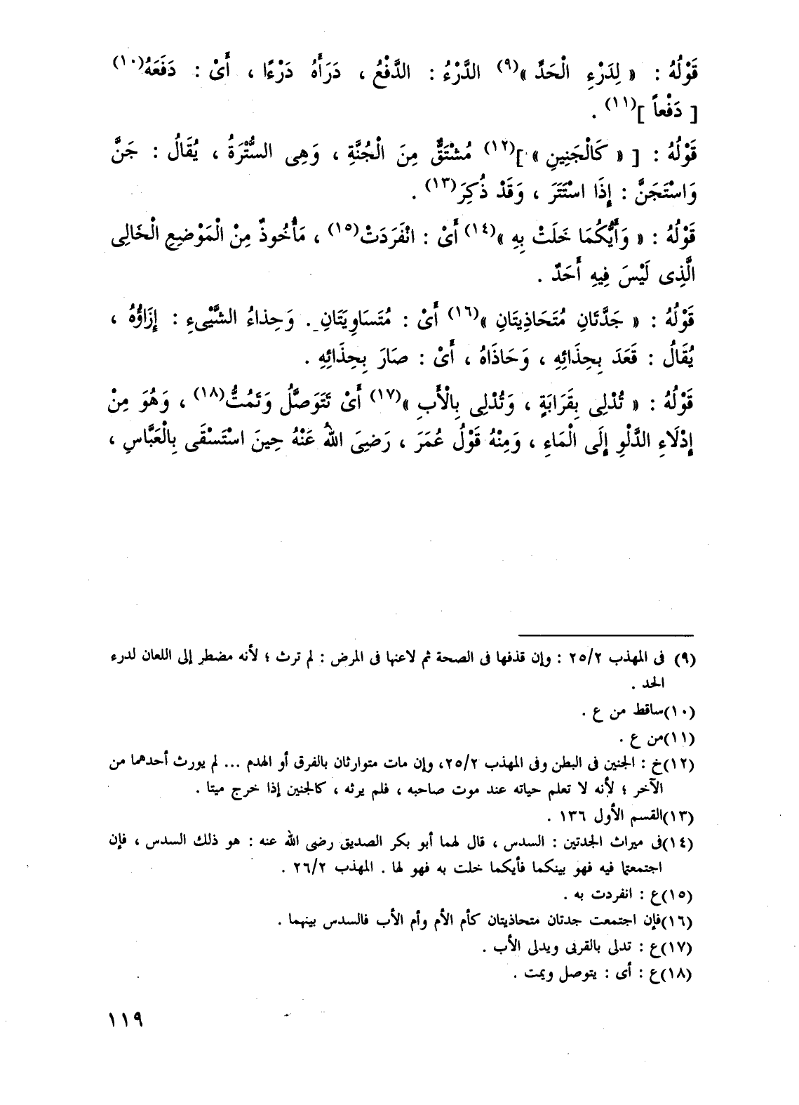 (¬14) فى ميراث الجدتين: السدس، قال لهما أبو بكر الصديق - رضي الله عنه -: هو ذلك السدس، فإن اجتمعتما فيه فهو بينكما فأيكما خلت به فهو لها. المهذب 2/ 26.