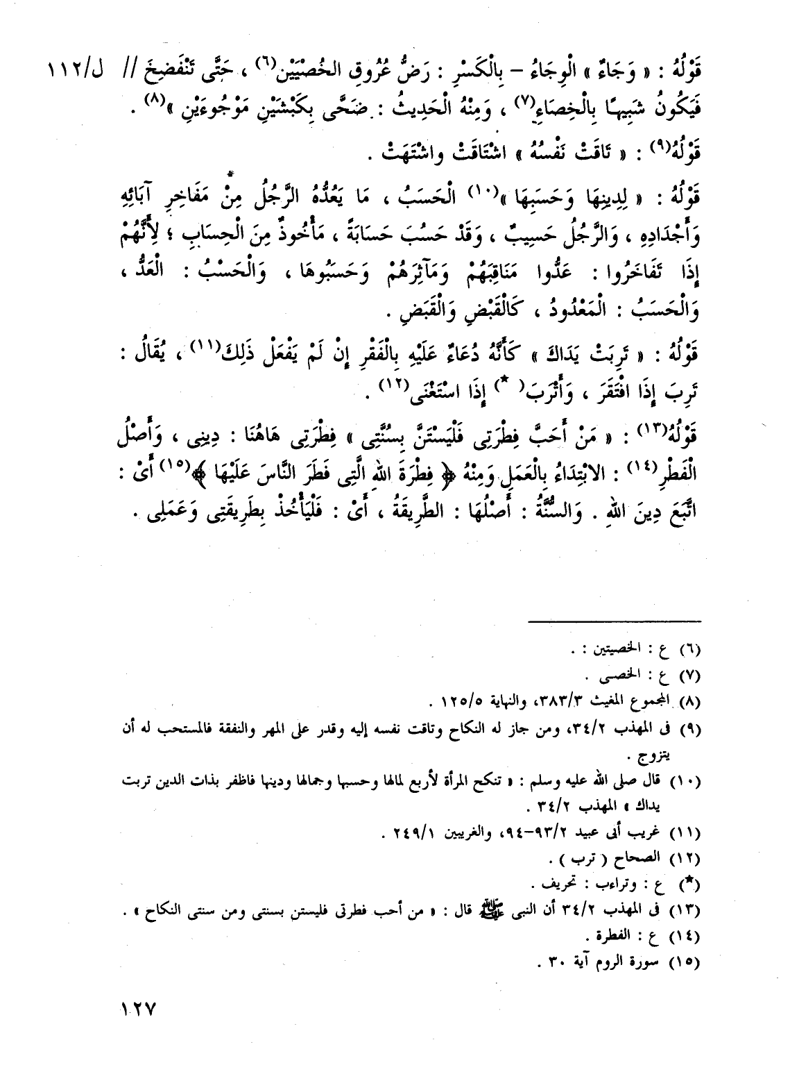 (¬13) فى المهذب 2/ 34 أن النبى - صلى الله عليه وسلم - قال: "من أحب فطرتى فليستن بسنتى ومن سنتى النكاح".