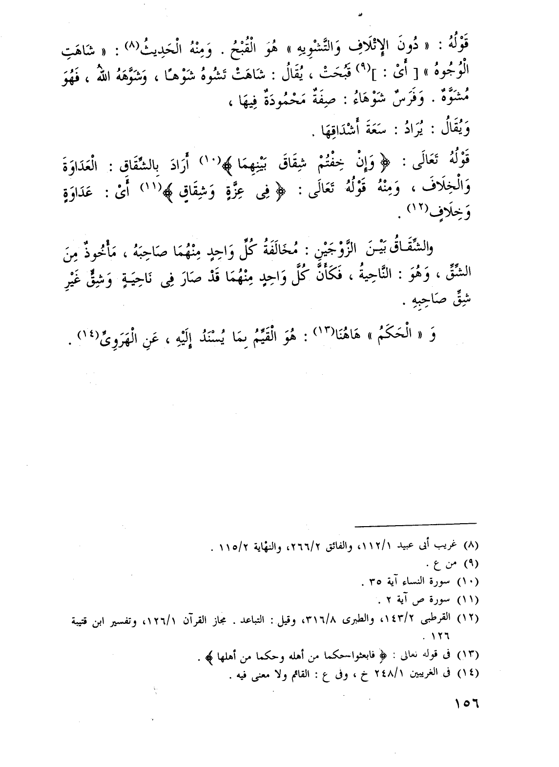 قَوْلُهُ تَعَالَى: {وَإِنْ خِفْتُمْ شِقَاقَ بَيْنِهِمَا} (¬10) أَرَادَ بالشِّقَاق: الْعَدَاوَةَ وَالْخِلَافَ، وَمِنْهُ قَوْلُهُ تَعَالَى: {فِي عِزَّةٍ وَشِقَاقٍ} (¬11) أَىْ: عَدَاوَةٍ وَخِلَافٍ (¬12).