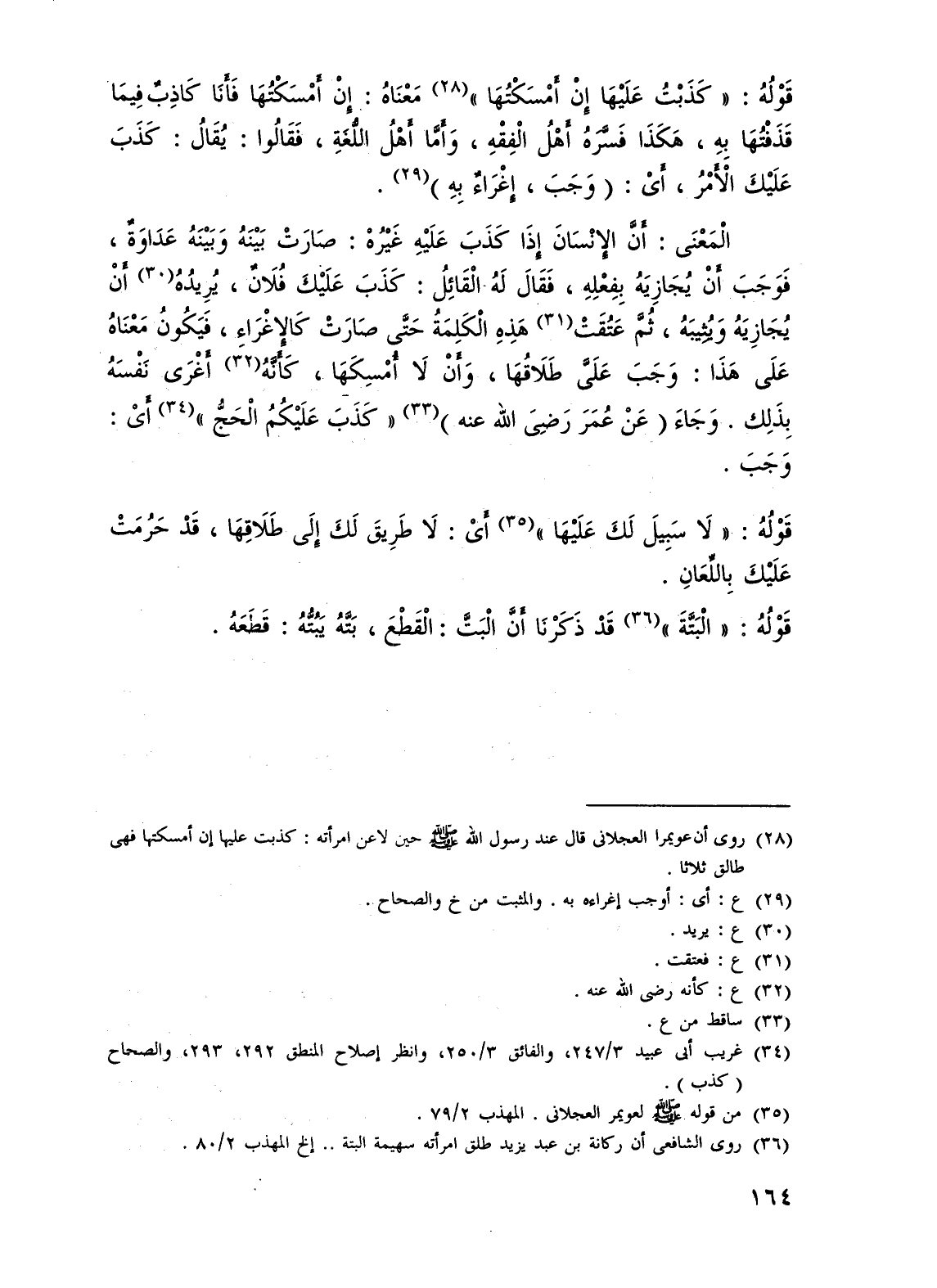 قَوْلُهُ: "كَذَبْتُ عَلَيْهَا إِنْ أَمْسَكْتُهَا" (¬28) مَعْنَاهُ: إنْ أَمْسَكْتُهَا فَأَنَا كَاذِبٌ فِيمَاْ قَذَفْتُهَا بِهِ، هَكَذَا فَسَّرهُ أهْلُ الْفِقْهِ، وَأَمَّا أَهْلُ اللُّغةِ، فَقَالُوا: يُقَالُ: كَذَبَ عَلَيْكَ الْأَمْرُ، أَىْ: (وَجَبَ، إِغْرَاءٌ بِهِ) (¬29).