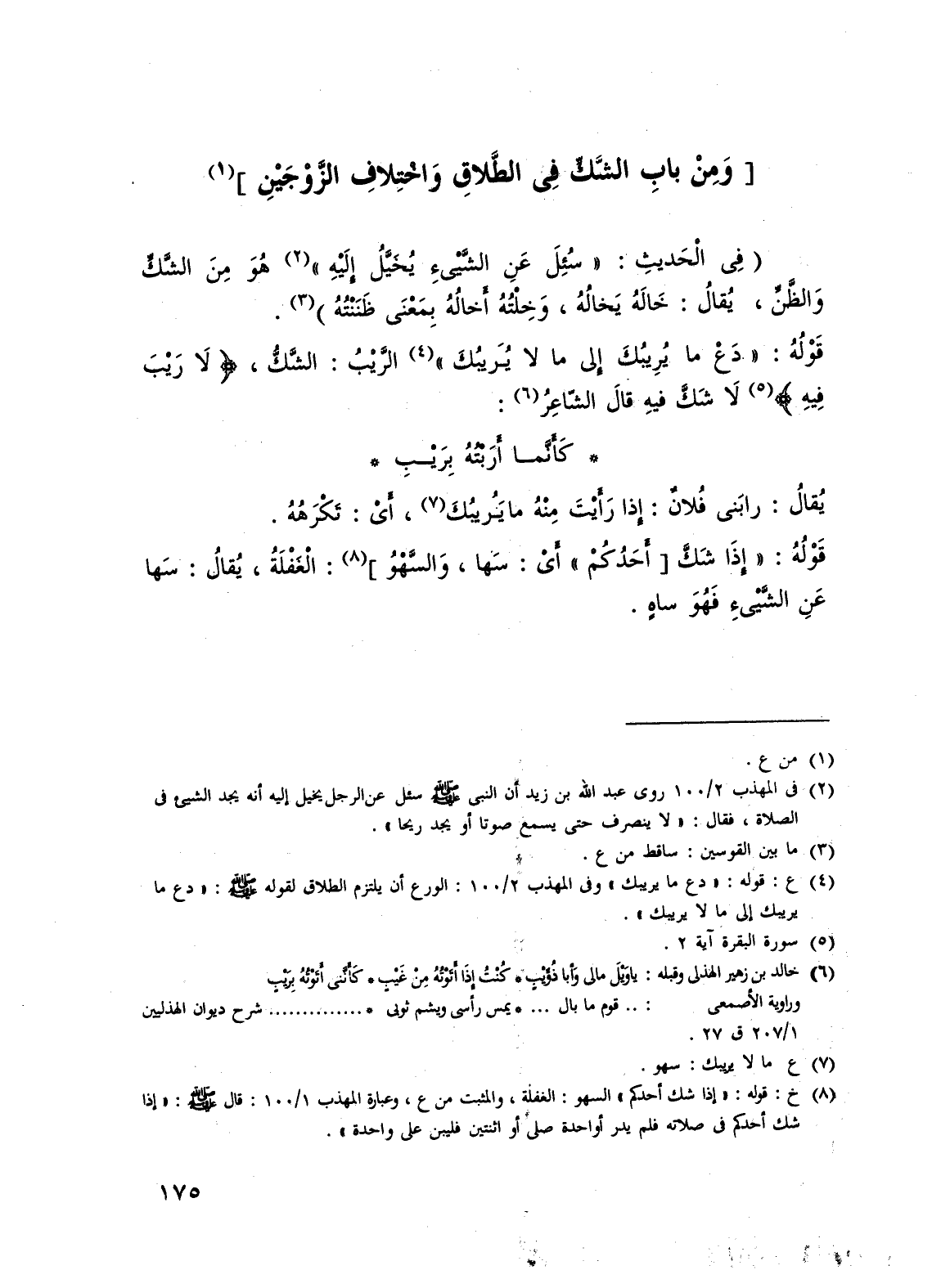 (¬4) ع: قول: "دع ما يريبك" وفى المهذب 2/ 100: الورع أن يلتزم الطلاق لقوله - صلى الله عليه وسلم -: "دع ما يريبك إلى ما لا يريبك".