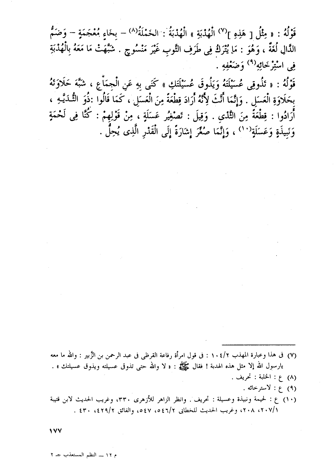 (¬7) فى هذا وعبارة المهذب 2/ 104: فى قول امرأة رفاعة القرظى فى عبد الرحمن بن الزَّبير: والله ما معه يا رسول الله إلا مثل هذه الهدبة! فقال - صلى الله عليه وسلم -: "لا والله حتى تذوقى عسيلته ويذوق عسيلتك".