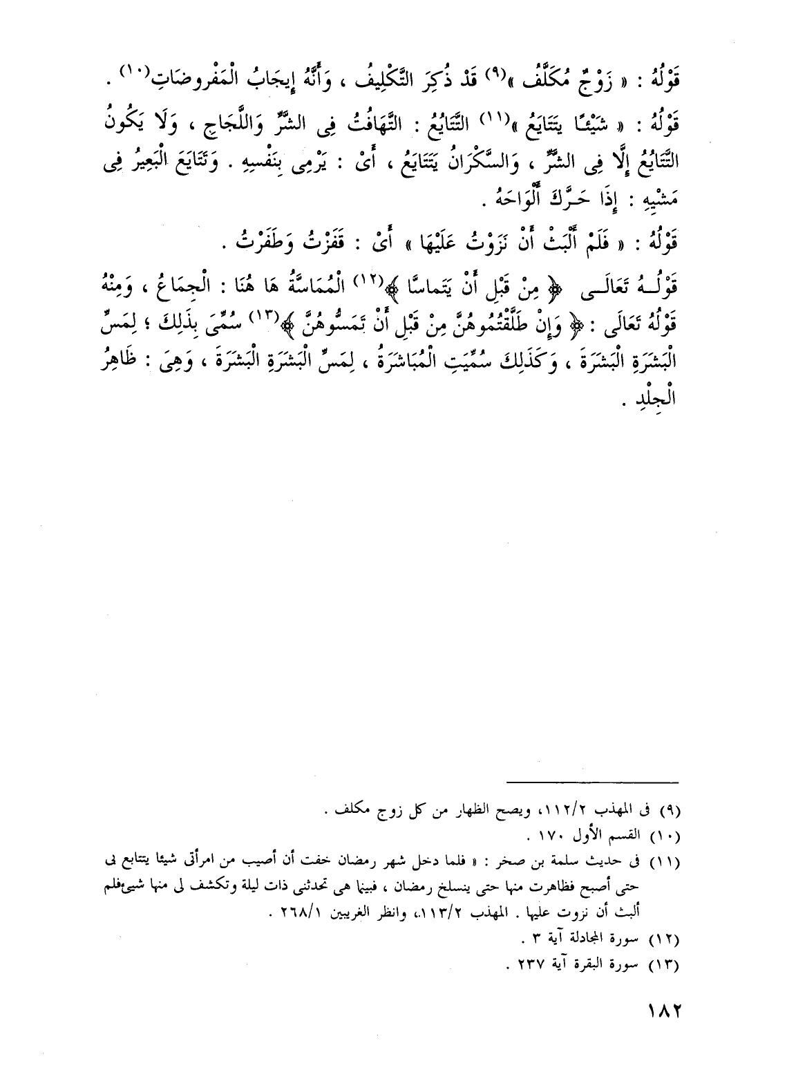 (¬11) فى حديث سلمة بن صخر: "فلما دخل شهر رمضان خفت أن أصيب من امرأتى شيئا يتتابع بى حتى أصبح فظاهرت منها حتى ينسلخ رمضان، فبينما هى تحدثنى ذات ليلة وتكشف لى منها شيئ فلم ألبث أن نزوت عليها. المهذب 2/ 113، وانظر الغريبين 1/ 268.