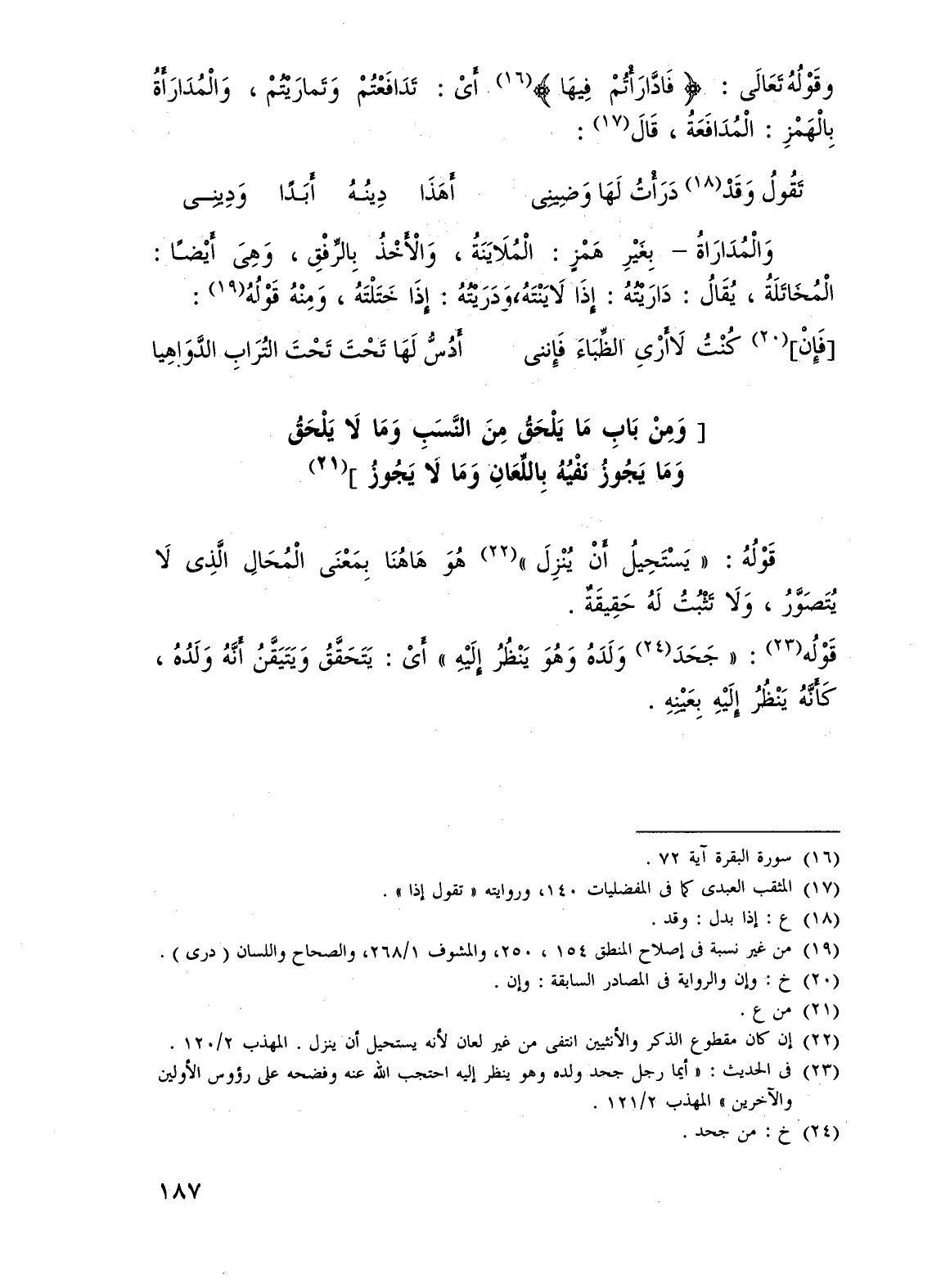 وقَوْلُهُ تَعَالَى: {فَادَّارَأْتُمْ فِيهَا} (¬16) أَىْ: تَدَافَعْتُمْ وَتَمارَيتُمْ، وَالْمُدَارَأَةُ بِالْهَمْزِ: الْمُدَافَعَةُ، قَالَ (¬17):