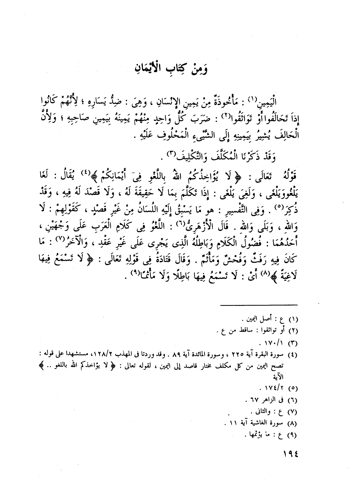 (¬4) سورة البقرة آية 225، وسورة المائدة آية 89. وقد وردتا فى المهذب 2/ 128، مستشهدا على قوله: تصح اليمين من كل مكلف مختار قاصد الى اليمين، لقوله تعالى: {لَا يُؤَاخِذُكُمُ اللَّهُ بِاللَّغْوِ. . .} الآية.