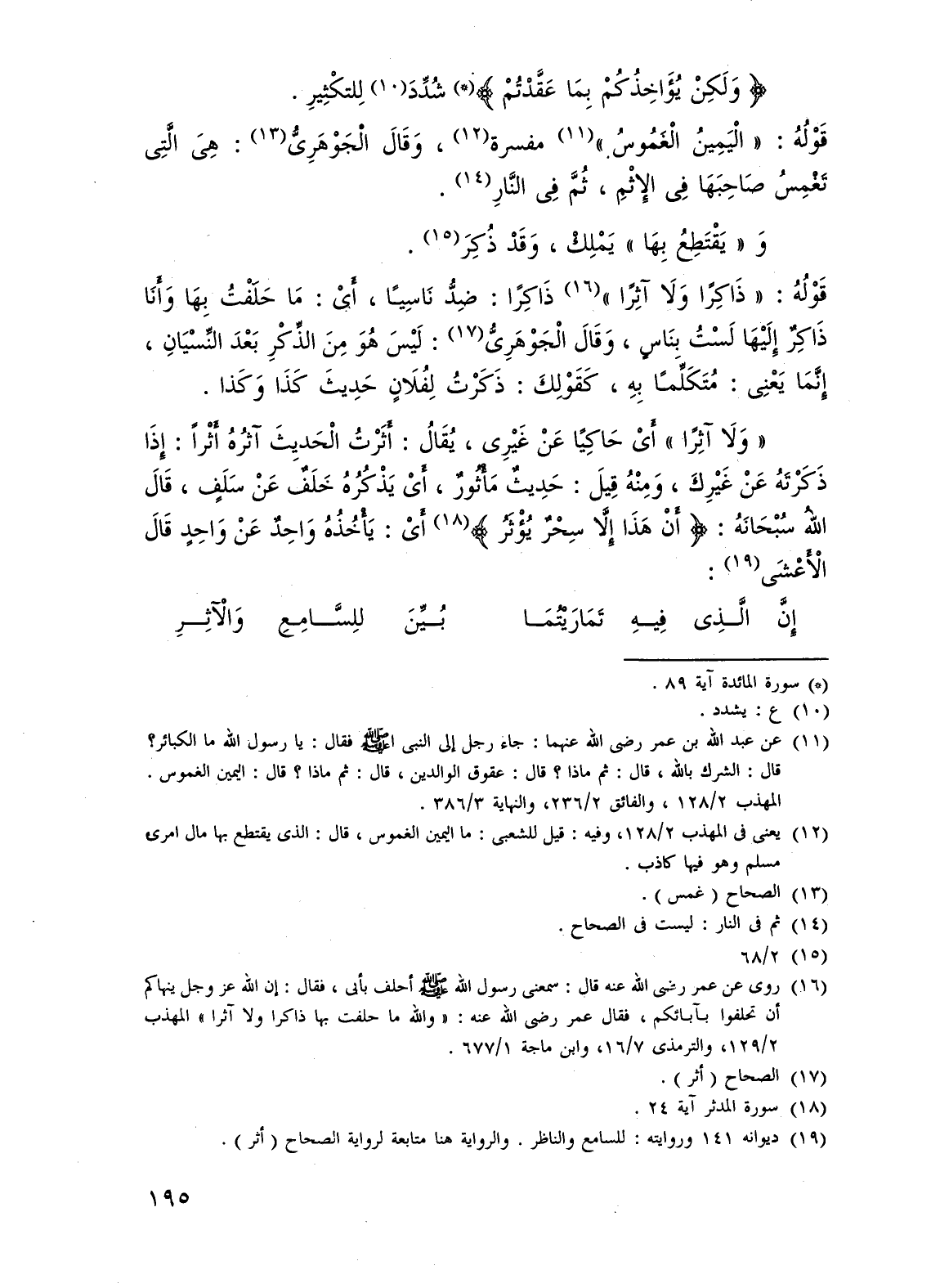(¬12) يعنى فى المهذب 2/ 128، وفيه: قيل للشعبى: ما اليمين الغموس، قال: الذى يقتطع بها مال امرى مسلم وهو فيها كاذب.