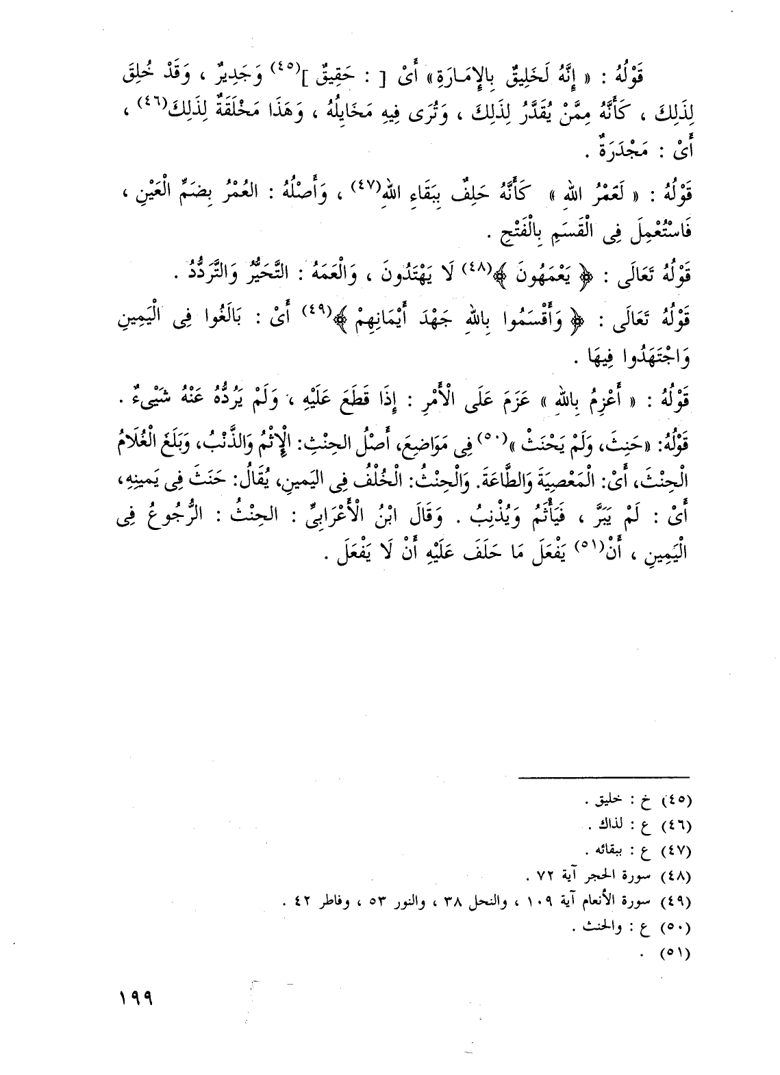 قَوْلُهُ: "حَنِثَ، وَلَمْ يَحْنَثْ" (¬50) فِى مَوَاضِعَ، أَصْلُ الحِنْثِ: الْإِثْمُ وَالذَّنْبُ، وَبَلَغَ الْغُلَامُ الْحِنْثَ، أَىْ: الْمَعْصِيَةَ وَالطَّاعَةَ. وَالْحِنْثُ: الْخُلْفُ فِى اليَمينِ، يُقَالُ: حَنَثَ فِى يَمينِهِ، أَىْ: لَمْ يَبَرَّ، فَيَأْثَمُ وَيُذْنِبُ. وَقَالَ ابْنُ الأَعْرَابِىِّ: الحِنْثُ: الرُّجُوعُ فِى الْيَمِينِ، أَنْ (¬51) يَفْعَلَ مَا حَلَفَ عَلَيْهِ أَنْ لَا يَفْعَلَ.