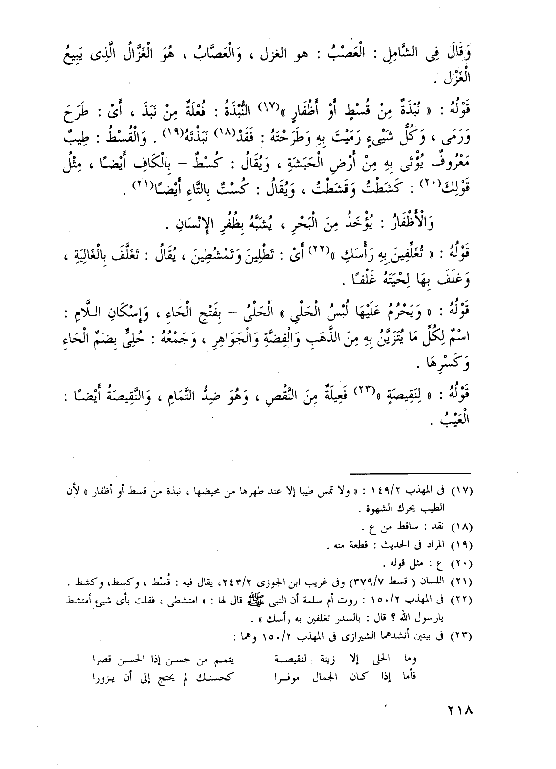 (¬17) فى المهذب 2/ 149: "ولا تمس طيبا إلا عند طهرها من محيضها، نبذة من قسط أو أظفار" لأن الطيب يحرك الشهوة.