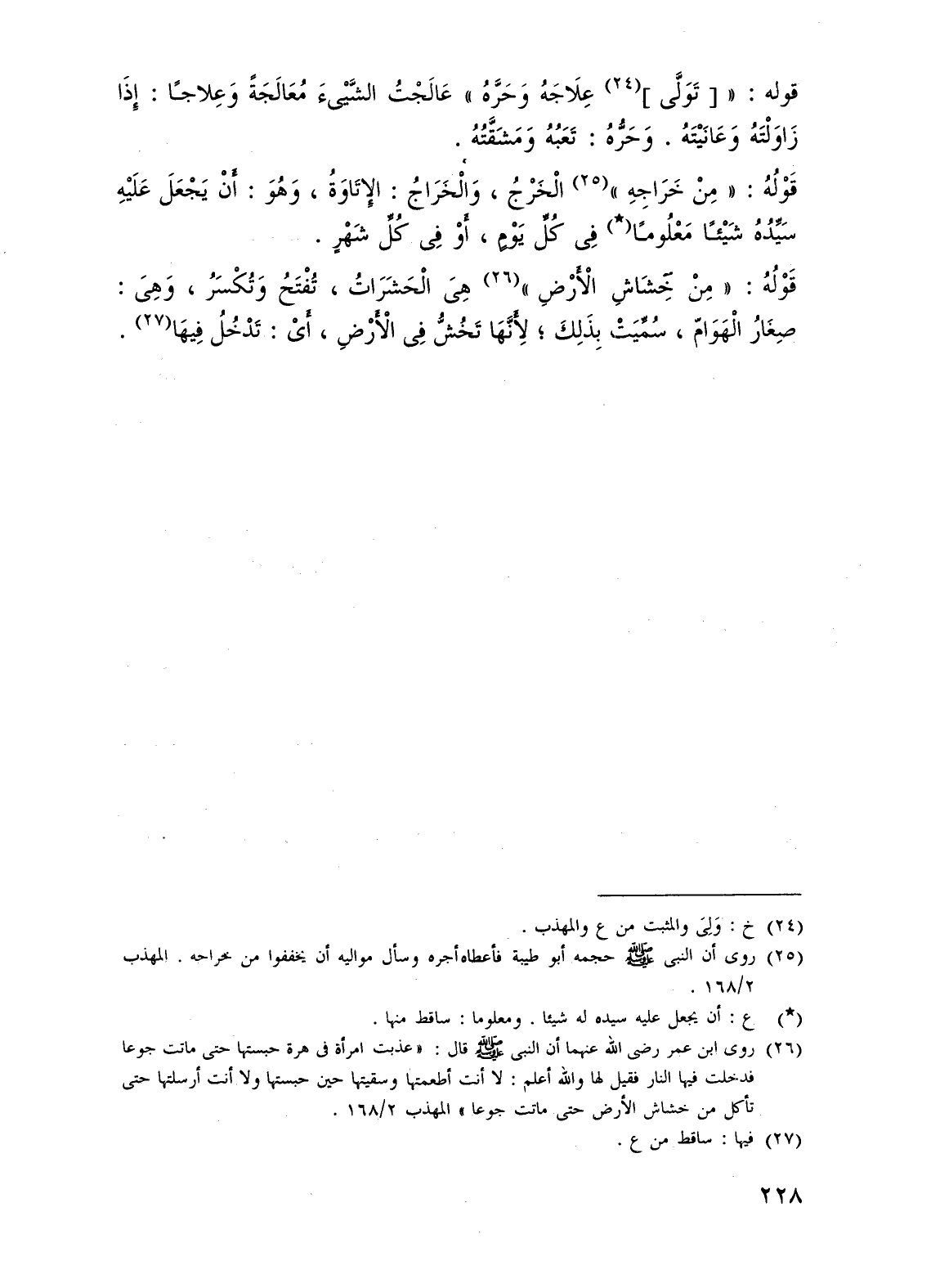 قوله: " [تَوَلَّى] (¬24) عِلَاجَهُ وَحَرَّهُ" عَالَجْتُ الشَّيْىءَ مُعَالَجَةً وَعِلاجًا: إِذَا زَاوَلْتَهُ وَعَانَيْتَهُ. وَحَرُّهُ: تَعَبُهُ وَمَشَقَّتُهُ.