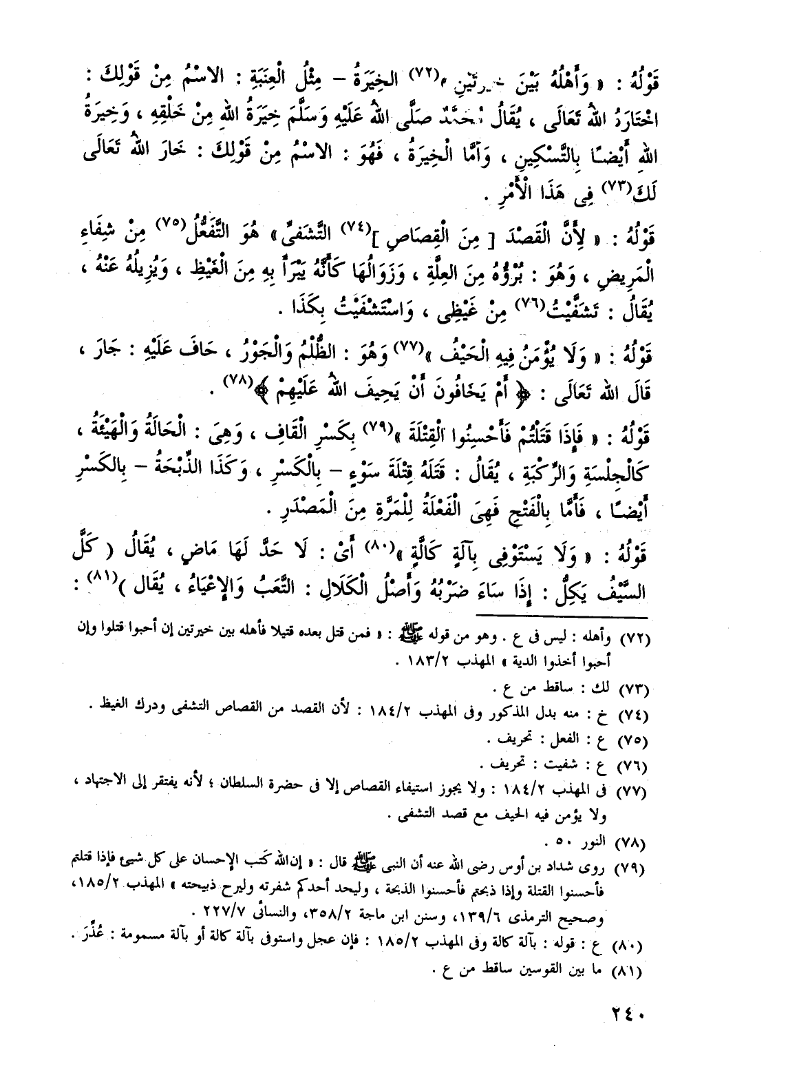 (¬79) روى شداد بن أوس - رضي الله عنه - أن النبى - صلى الله عليه وسلم - قال: "إن الله كتب الإحسان على كل شيىء فإذا قتلتم فأحسنوا القتلة وإذا ذبحتم فأحسنوا الذبحة، وليحد أحدكم شفرته وليرح ذبيحته" المهذب 2/ 185، وصحيح الترمذى 6/ 139، وسنن ابن ماجة 2/ 358، والنسائي 7/ 227.
