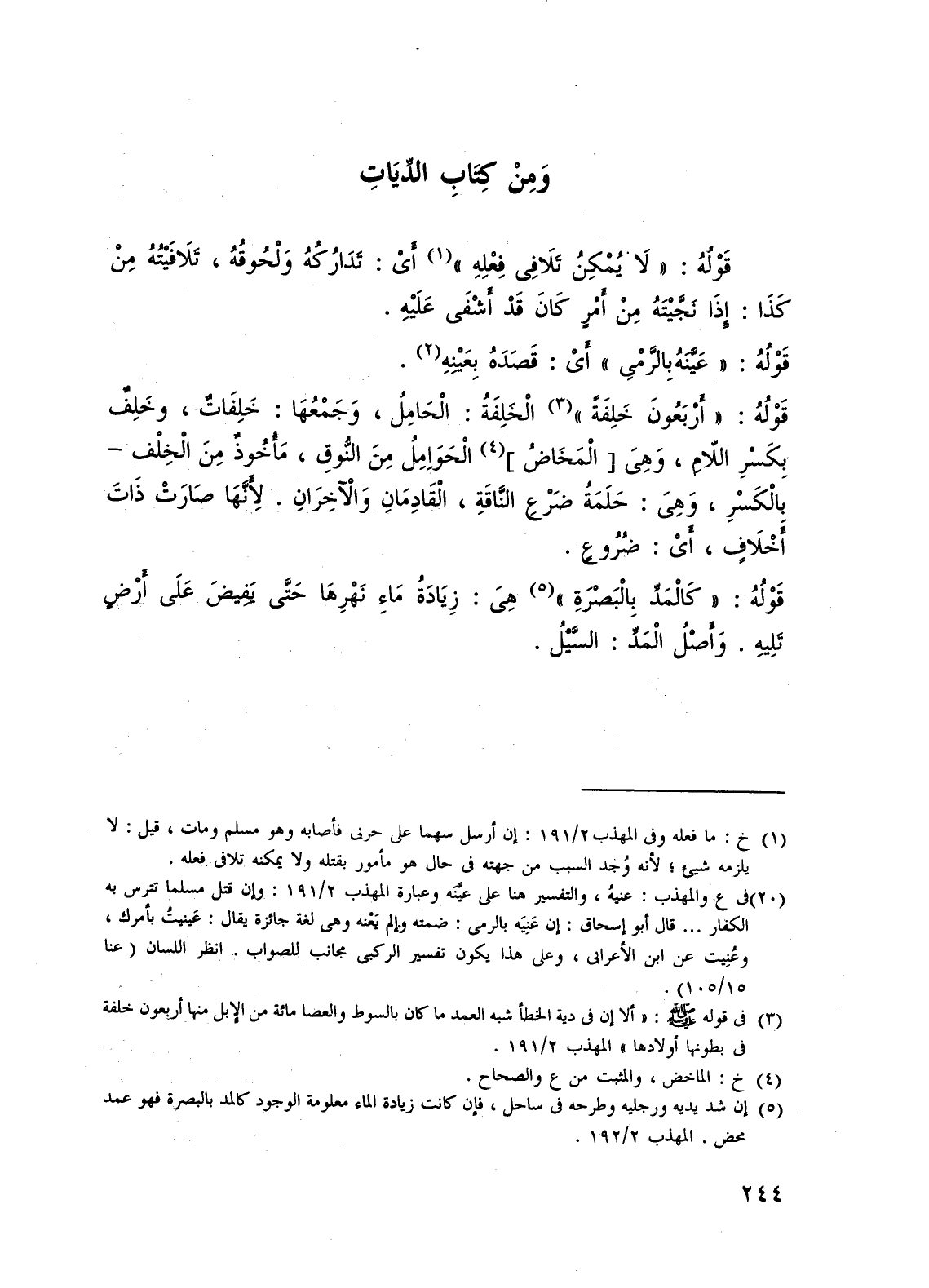 (¬3) فى قوله - صلى الله عليه وسلم -: "ألا إن فى دية الخطأ شبه العمد ما كان بالسوط والعصا مائة من الإبل منها أربعون خلفة فى بطونها أولادها" المهذب 2/ 191.