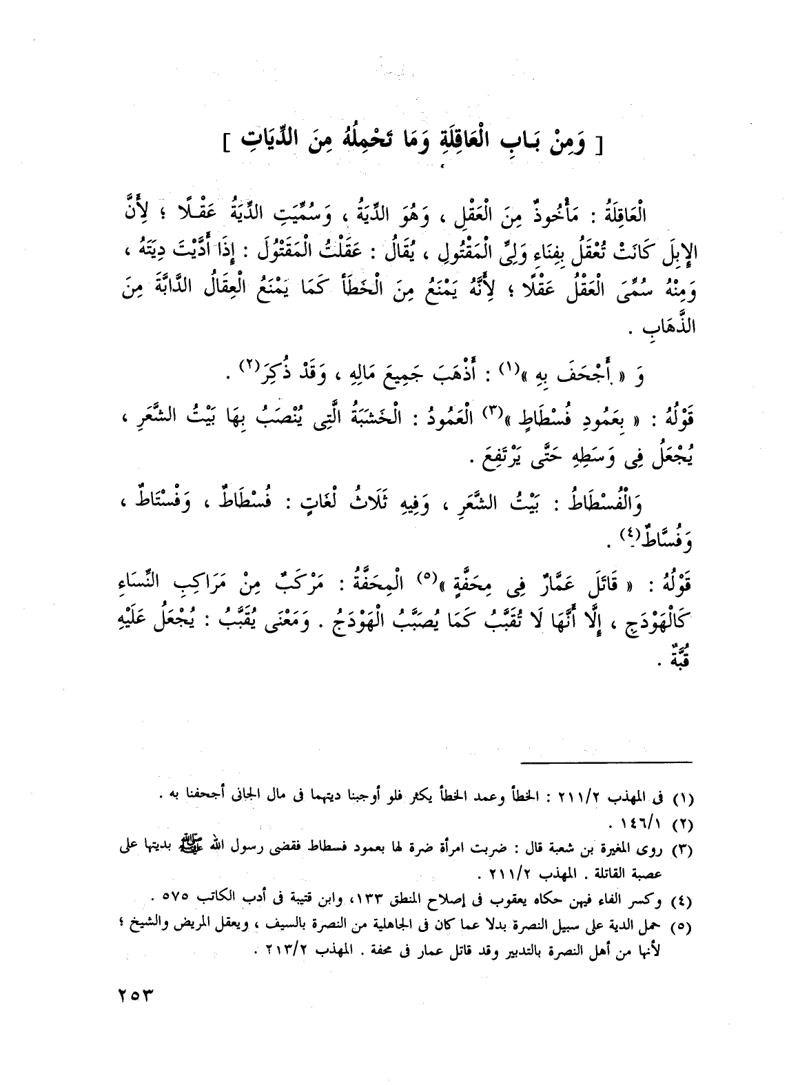 (¬5) حمل الدية على سبيل النصرة بدلا عما كان في الجاهلية من النمرة يالسيف، هو يعقل المريض والشيخ؛ لأنها من أهل النمرة بالتدبير وقد قاتل عمار في محفة. المهذب 2/ 213.