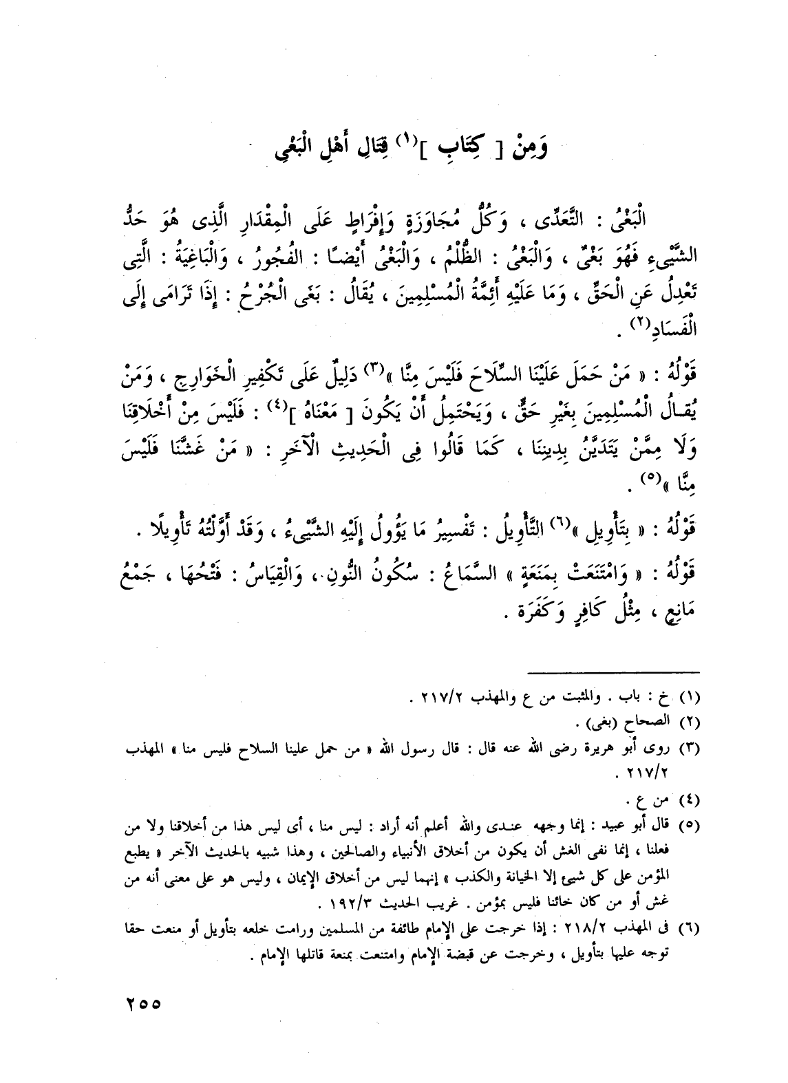 (¬6) في المهذب 2/ 218: إذا خرجت على الإمام طائفة من المسلمين ورامت خلعه بتأويل أو منعت حقا توجه عليها بتأويل، وخرجت عن قبضة الإمام وامتنعت بمنعة قاتلها الإمام.