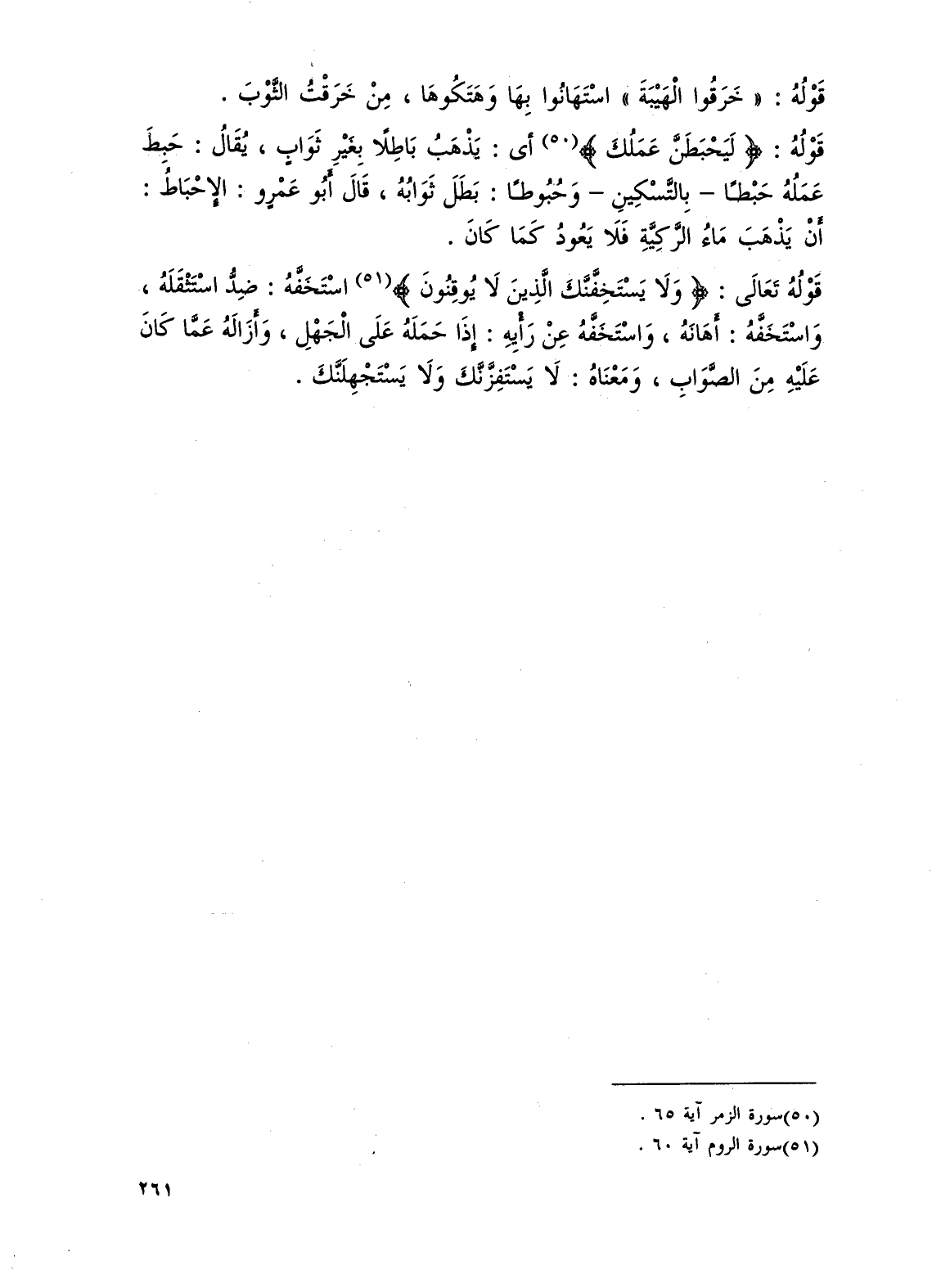 قَوْلهُ تعَالَى: {وَلَا يَسْتَخِفَّنَّكَ الَّذِينَ لَا يُوقِنُونَ} (¬51) اسْتَخَفَّة: ضِدُّ اسْتَثْقَلَة، وَاسْتَخَفَّة: أَهَانَة، وَاسْتَخَفَّة عِنْ رَأْيِهِ: إذَا حَمَلَة عَلَى الْجَهْلِ، وَأَزَالَه عَمَّا كَانَ عَلَيْهِ مِنَ الصَّوَابِ، وَمَعْنَاه: لَا يَسْتَفِزنَّكَ وَلَا يَسْتَجْهِلَنَّكَ.
