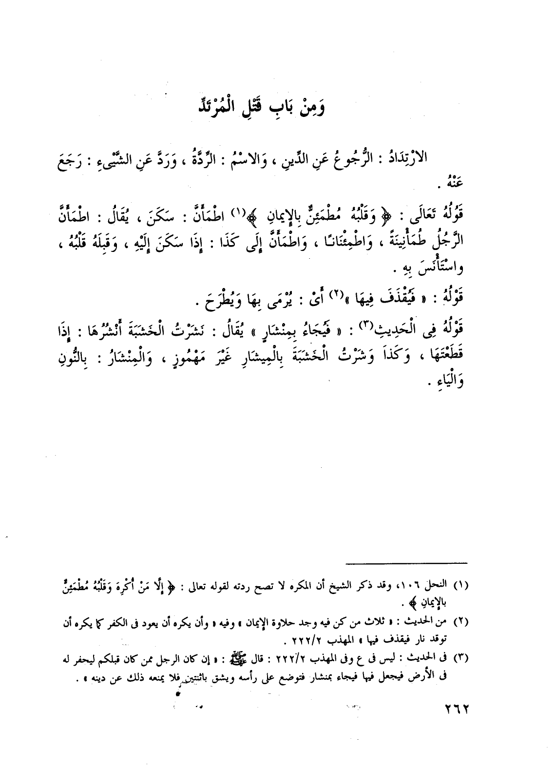 (¬1) النحل 106، وقد ذكر الشيخ أن المكره لا تصح ردته لقوله تعالى: {إِلَّا مَنْ أُكْرِهَ وَقَلْبُهُ مُطْمَئِنٌّ بِالْإِيمَانِ}.