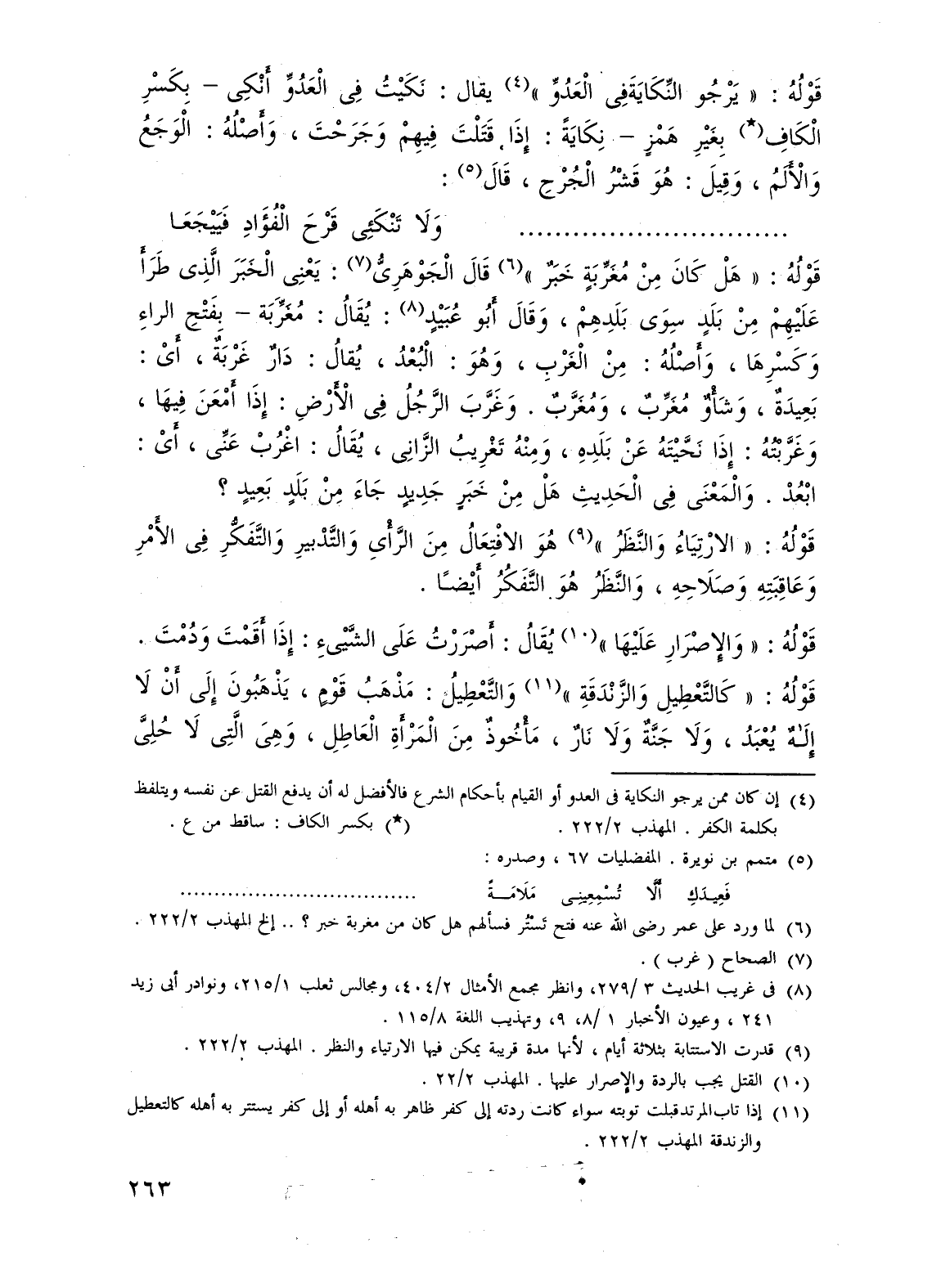 قَوْلُهُ: "يَرْجُو النِّكَايَةَ فِىْ العَدُوِّ" (¬4) يقال: نَكَيْتُ فِى الْعَدُوِّ أَنْكِى -بِكَسْرِ الْكَافِ (*) بِغَيْرِ هَمْزٍ-. نِكَايَةً: إِذَا قَتَلْتَ فِيهِمْ وَجَرَحْتَ، وَأَصْلُهُ: الْوَجَعُ وَالْأَلَمُ، وَقِيلَ: هُوَ قَشْرُ الْجُرْحِ، قَالَ (¬5):