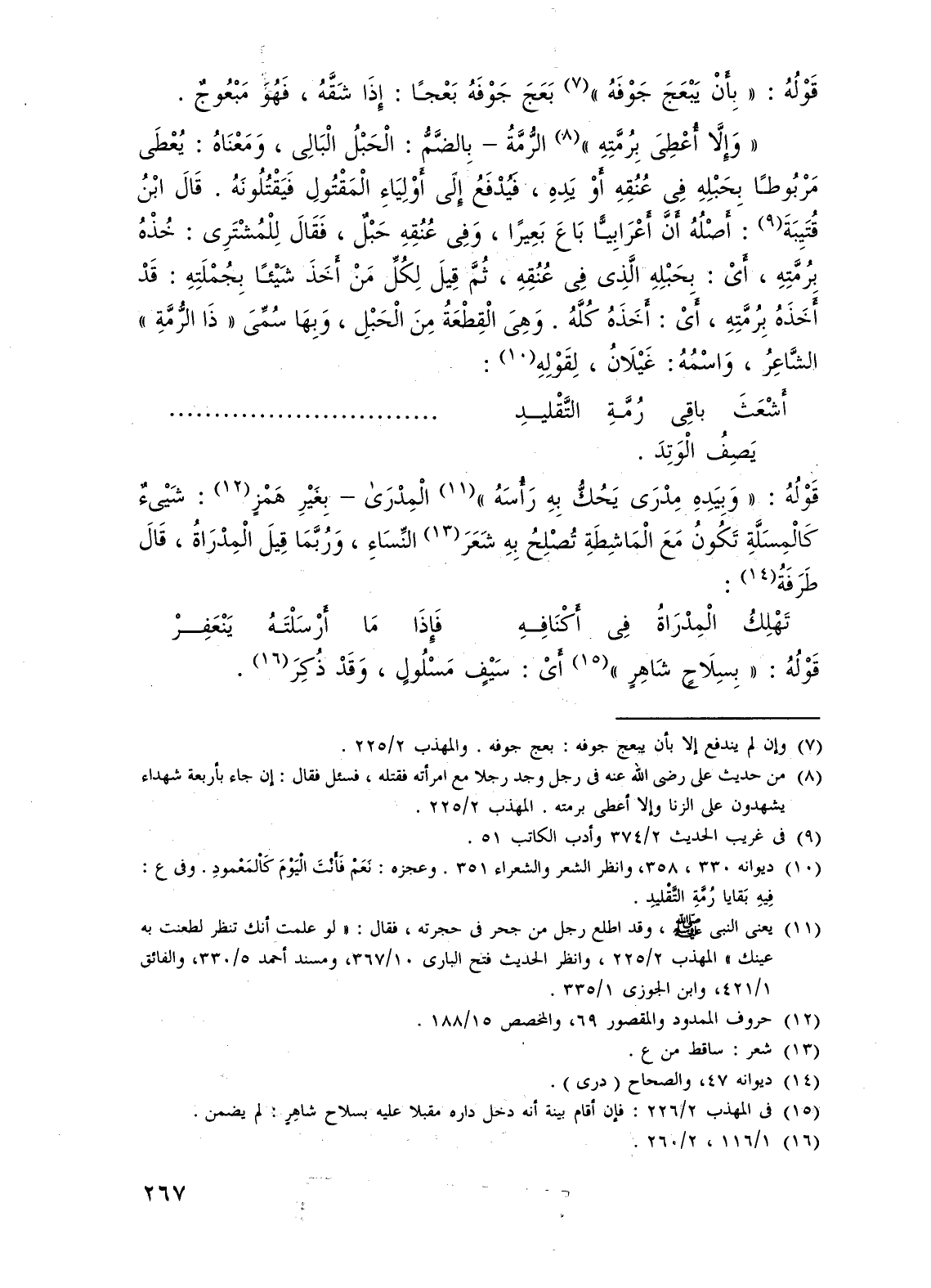 "وَإِلَّا أعْطِىَ بِرُمَّتِهِ" (¬8) الرُّمَّةُ- بالضَّمُّ: الْحَبْلُ الْبَالِى، وَمَعْنَاهُ: يُعْطَى مَرْبُوطًا بِحَبْلِهِ فِى عُنُقِهِ أو يَدِهِ، فيدْفَعُ إِلى أَولِيَاءِ الْمَقْتُولِ فَيَقْتُلُونَهُ. قَالَ ابْنُ قُتَيِبَةَ (¬9): أَصْلُهُ أَنَّ أَعْرَابِيُّا بَاعَ بَعِيرًا، وَفِى عُنُقِهِ حَبْلٌ، فَقَالَ لِلْمُشْتَرِى: خُذْهُ برُمَّتِهِ، أَنْ: بحَبْلِهِ الَّذِي فِى عُنُقِهِ، ثُمَّ قِيلَ لِكُلِّ مَنْ أَخَذَ شيئًا بِجُمْلَتِهِ: قَدْ أَخَذَهُ بِرُمَّتِهِ، أَيْ: أَخَذَهُ كُلَّهُ. وَهِيَ الْقِطْعَةُ مِنَ الْحَبْلِ، وَبِهَا سُمِّىَ "ذَا الرُّمَّةِ" الشَّاعِرُ، وَاسْمُهُ: غَيْلَانُ، لِقَوْلِهِ (¬10):