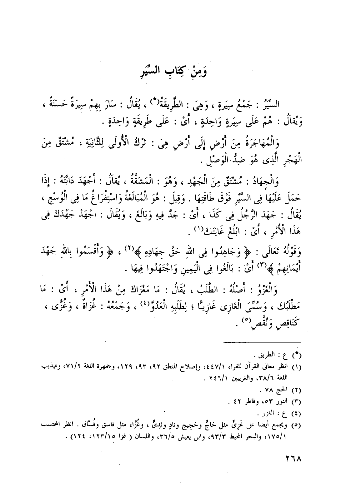 وَقَوْلُهُ تَعَالَى: {وَجَاهِدُوا فِي اللَّهِ حَقَّ جِهَادِهِ} (¬2)، {وَأَقْسَمُوا بِاللَّهِ جَهْدَ أَيْمَانِهِمْ} (¬3) أَىْ: بَالَغُوا فِى الْيَمِينِ وَاجْتَهَدُوا فِيهَا. وَالْغَزْوُ: أَصْلُهُ: الطَّلَبُ، يُقَالُ: مَا مَغْزَاكَ مِنْ هَذَا الأَمْرِ، أَيْ: مَا مَطْلَبُكَ، وَسُمِّىَ الْغَازِى غَازِيًّا، لِطَلَبِهِ الْعَدُوَّ (¬4)، وَجَمْعُهُ: غُزَاةٌ، وَغُزًّى، كَنَاقِصٍ وَنُقَّصٍ (¬5).