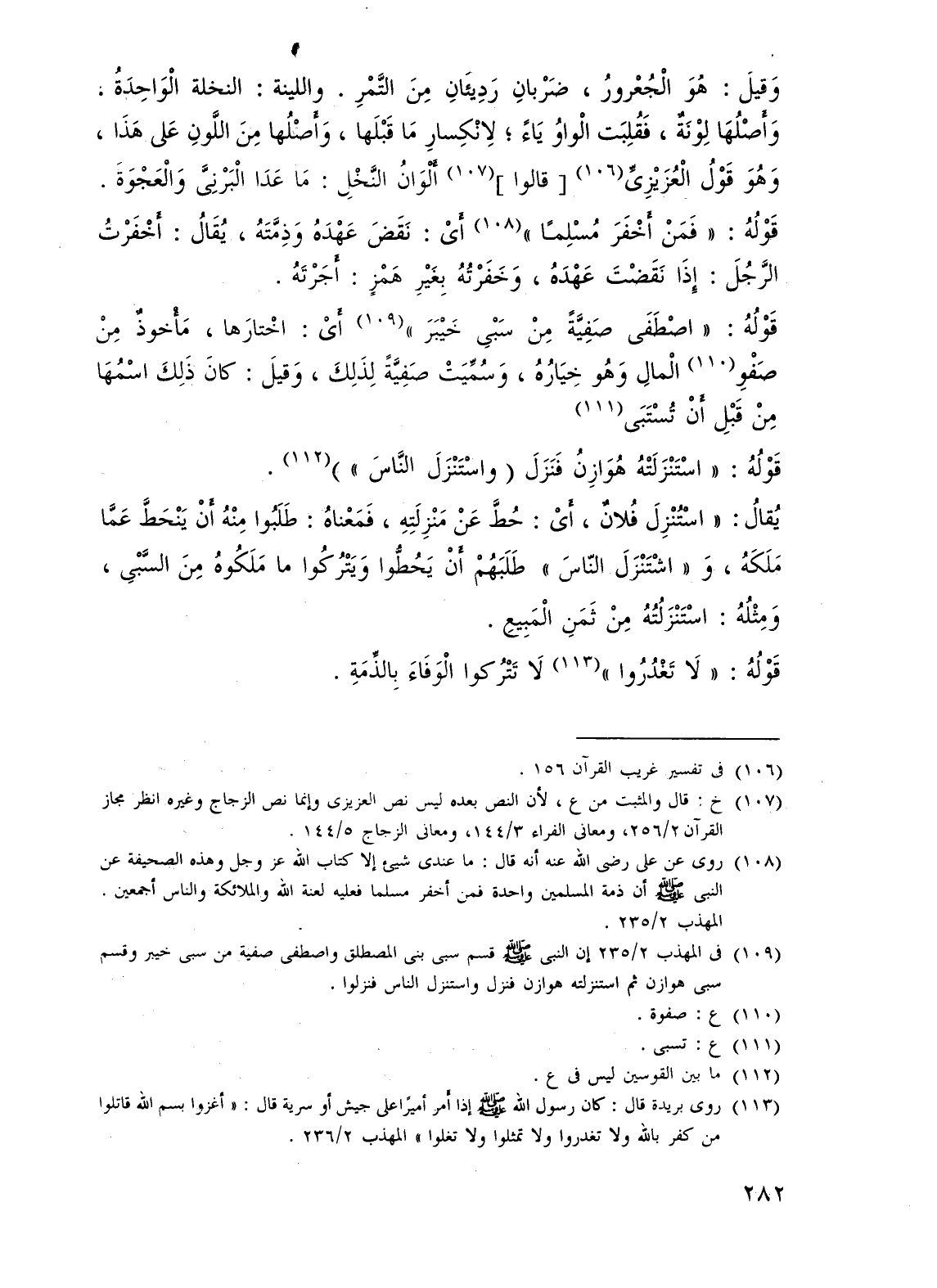 (¬109) في المهذب 2/ 235 إن النبي - صلى الله عليه وسلم - قسم سبى بني المصطلق واصطفى صفية من سبى خيبر وقسم سبى هوازن ثم استنزلته هوازن فنزل واستنزل الناس فنزلوا.