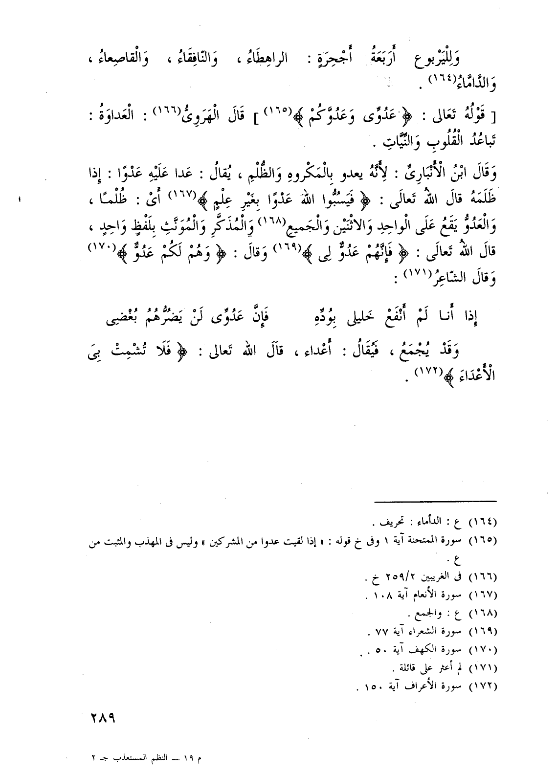 وَقَالَ ابْنُ الأَنْبَارِىِّ: لِأَنَّهُ يعدو بالْمَكْروهِ وَالظُّلْمِ، يُقالُ: عَدا عَلَيْهِ عَدْوَا: إِذا ظَلَمَهُ قالَ اللهُ تَعالَى: {فَيَسُبُّوا اللَّهَ عَدْوًا بِغَيْرِ عِلْمٍ} (¬167) أَيْ: ظُلْمًا، وَالْعَدُوُّ يَقَعُ عَلَى الْواحِدِ وَالاثْنَيْن وَالْجَميعِ (¬168) والْمُذَكَّرِ وَالْمُوَنَّثِ بِلَفْظٍ وَاحِدٍ، قالَ اللهُ تَعالَى: {فَإِنَّهُمْ عَدُوٌّ لِي} (¬169) وَقالَ: {وَهُمْ لَكُمْ عَدُوٌّ} (¬170) وَقالَ الشّاعِرُ (¬171):