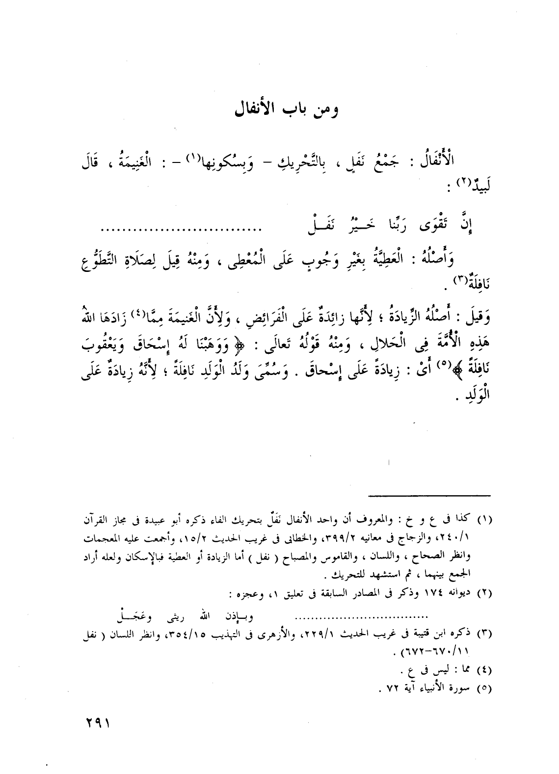 (¬1) كذا فى ع وخ: والمعروف أن أحد الأنفال نَفَلٌ بتحريك الفاء ذكره أبوه عبيدة في مجاز القرآن 1/ 240، والزجاج في معانيه 2/ 399، والخطابي في غريب الحديث 2/ 15 , وأجمعت عليه المعجمات وانظر الصحاح، واللسان، والقاموس والمصباح (نفل) أما الزيادة أو العطية فبالإسكان ولعله أراد الجمع بينهما، ثم استشهد للتحريك.