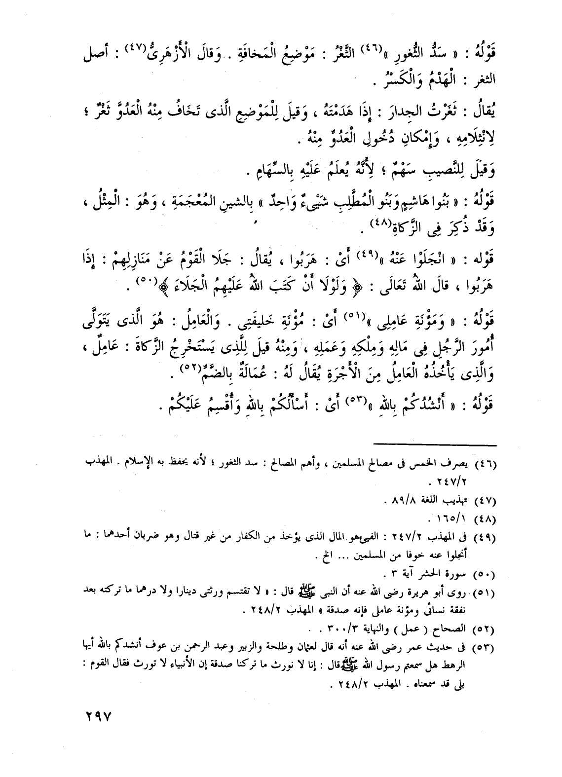 (¬49) في المهذب 2/ 247: الفيئ هو المال الذي يؤخذ من الكفار من غير قتال وهو ضربان أحدهما: ما أنجلوا عنه خوفا من المسلمين. . . الخ.